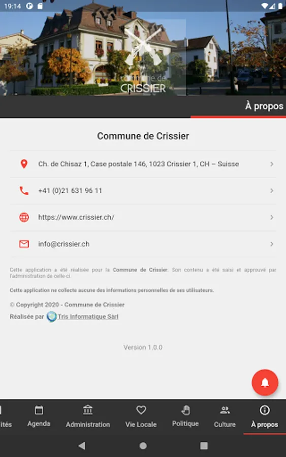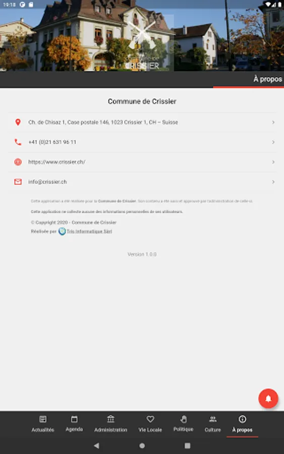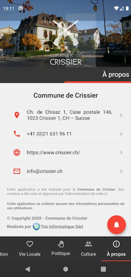 You can also easily access the contact information of the Municipality of Crissier and contact them with the push of a button.