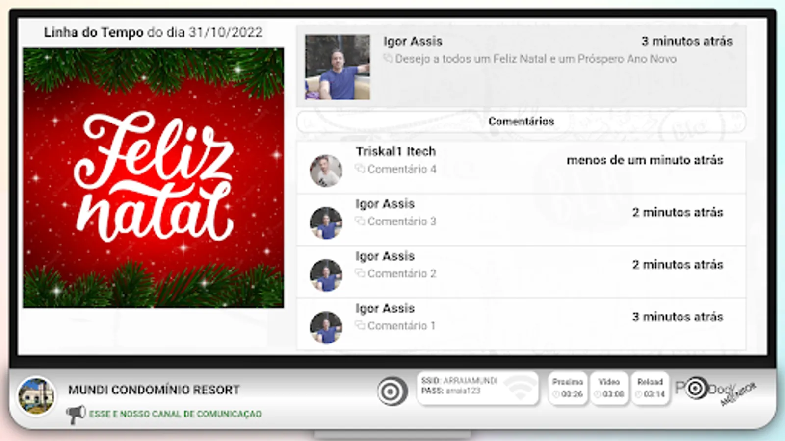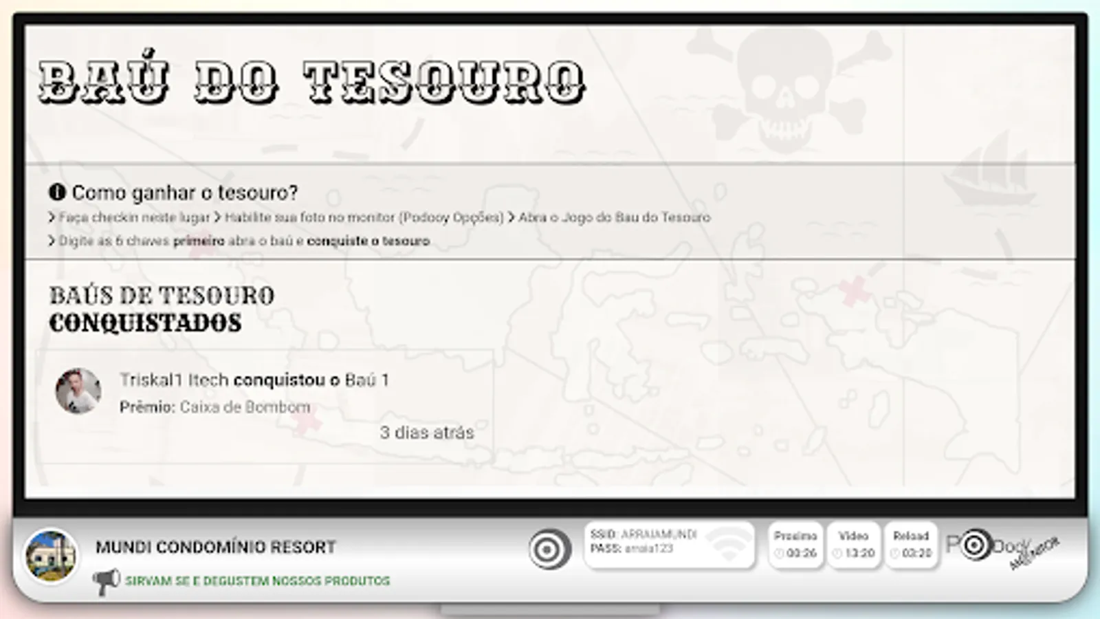Monitor: The monitor allows the contracting establishment to display various interactions with those present at its location. The user has free access to display or not display their profile on the monitor. In addition to being possible to display advertising material of the establishment about products and services that it provides. It has a ticker that keeps passing updated information that the monitor's contractor manages. On the monitor, the contractor can create treasure chests for distribution of gifts to their customers in order to create an atmosphere of fun and interactivity.