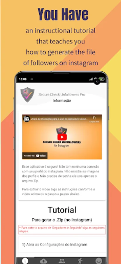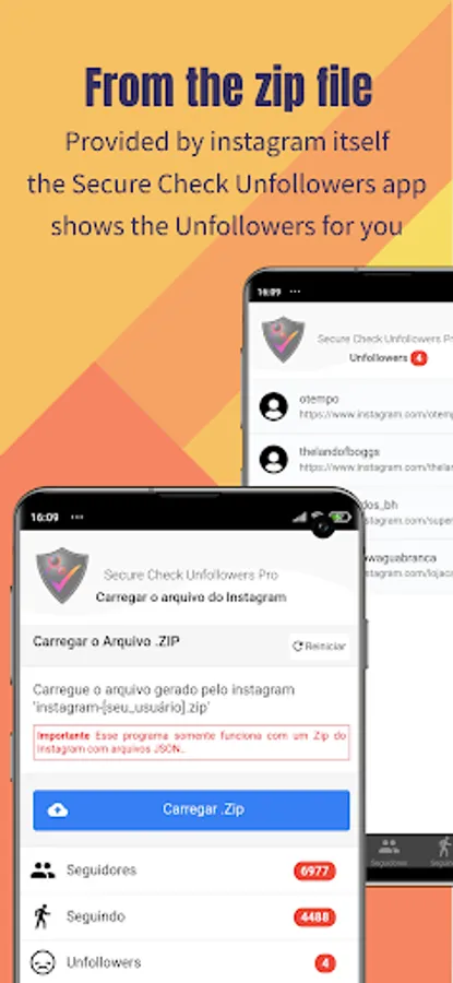 With "Secure Check Unfollowers Pro" (No Advertising) you can securely check your Unfollowers on Instagram (people you follow and who don't follow you) or (people who followed you who stopped following you). In addition to having access to the list of Followers (followers) and the list of people you are following (Following). It uses the safest method to verify this information as it does not require your Instagram login and password. It only needs the ZIP file provided by Instagram to generate the information.