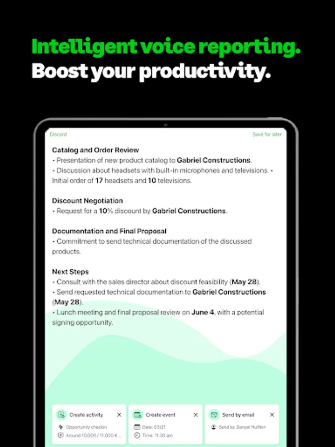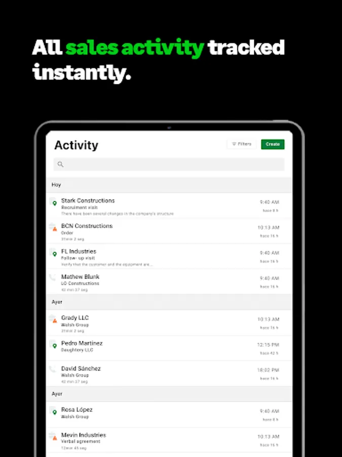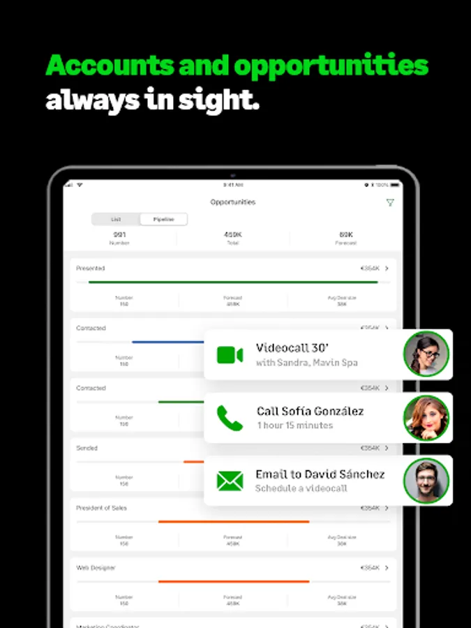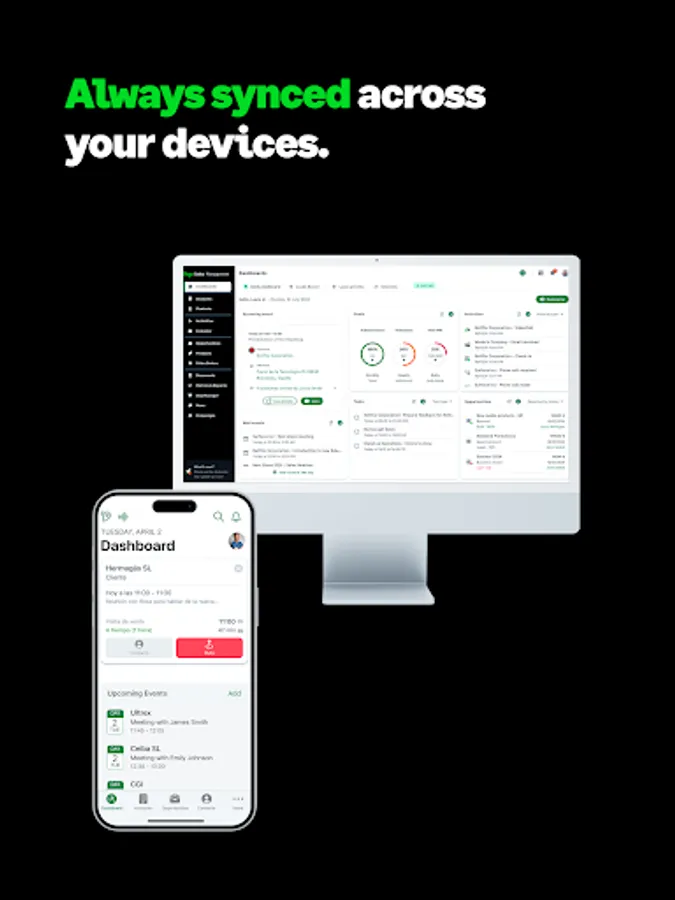 Calls, emails, geolocated visits, video calls, and WhatsApp. Everything is instantly recorded. Access key information wherever you are and achieve your goals.