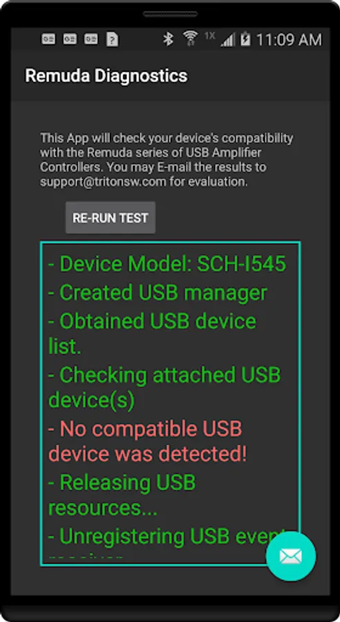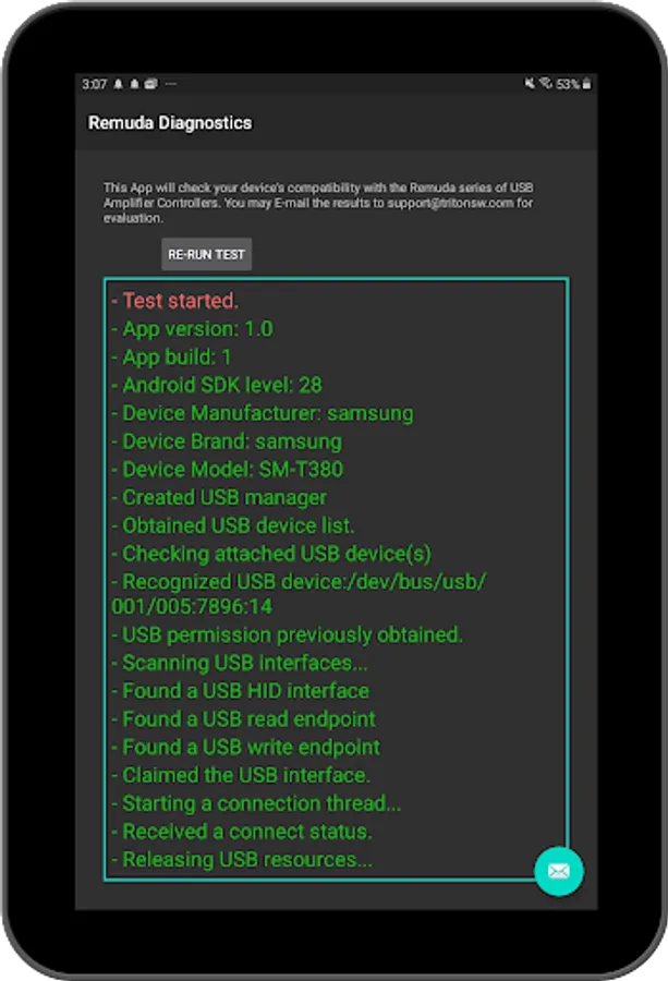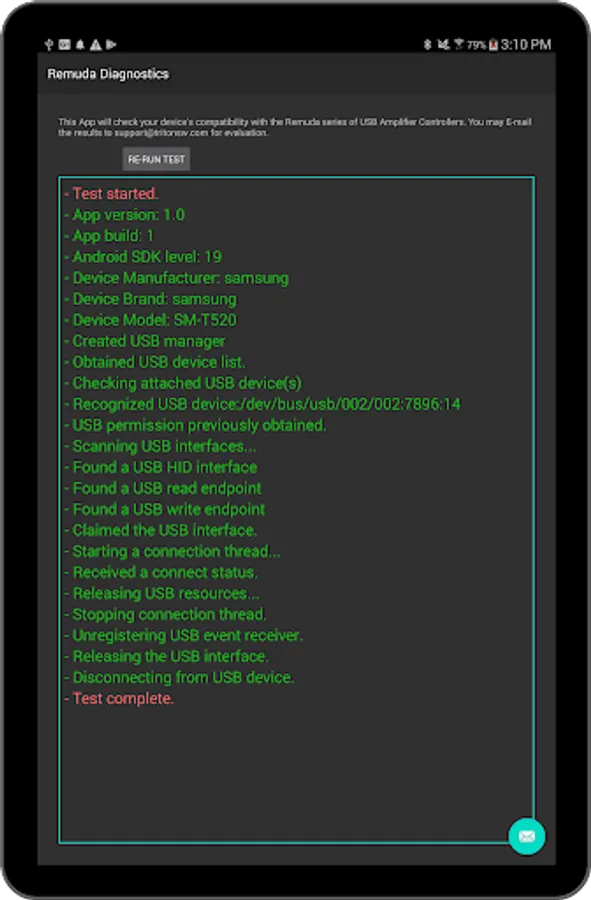 This app provides compatibility testing for Remuda™ and Remuda S/C™. It produces a visible log of all of the actions required to detect and connect to your Fender® USB amplifier. The reports can be emailed directly to support@tritonsw.com for evaluation.