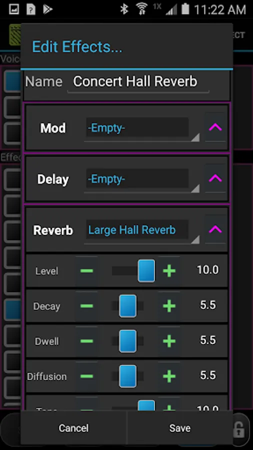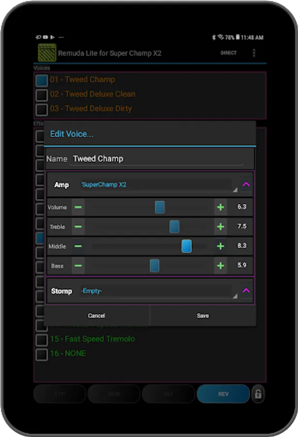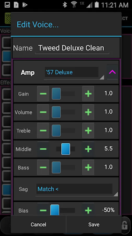 Select an amplifier Voice or F/X with a single tap. Tap it again to edit it. Make your changes and when you are happy with your changes, click on OK to save it back to the amplifier.