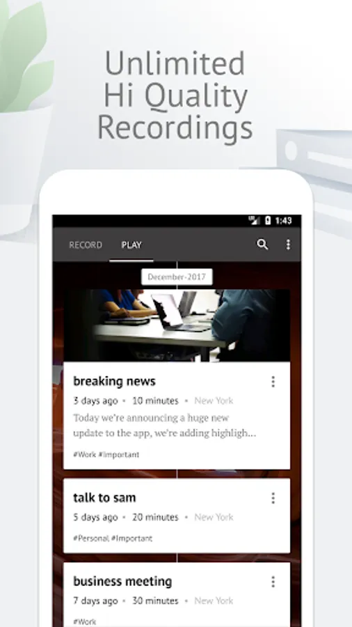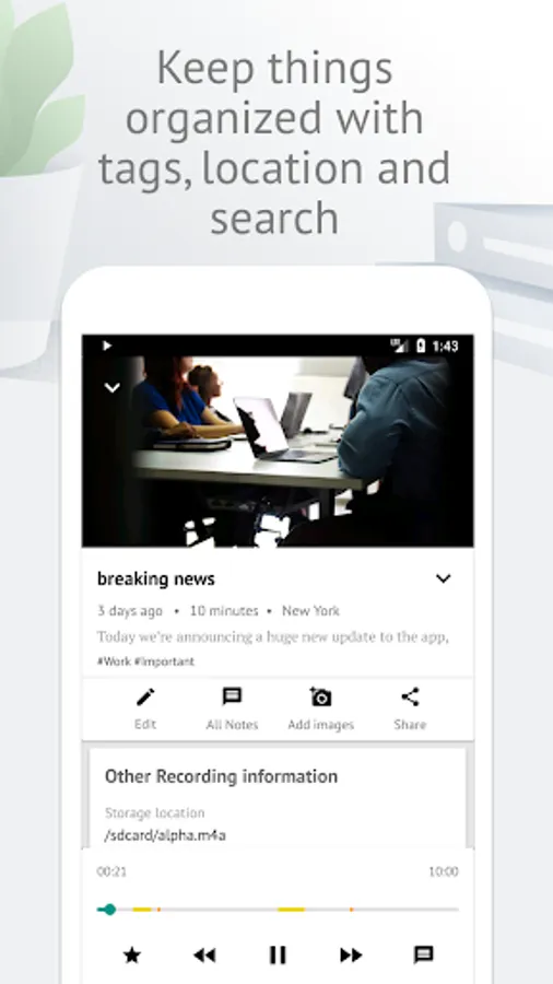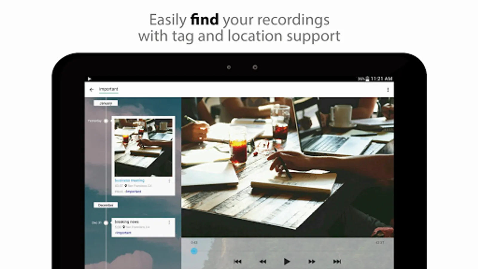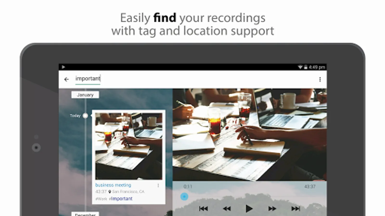 ★ This makes searching for recordings easier than ever before. Organize your audio recordings with tags like work, important, school and even your location, so finding the right recording is always a breeze.