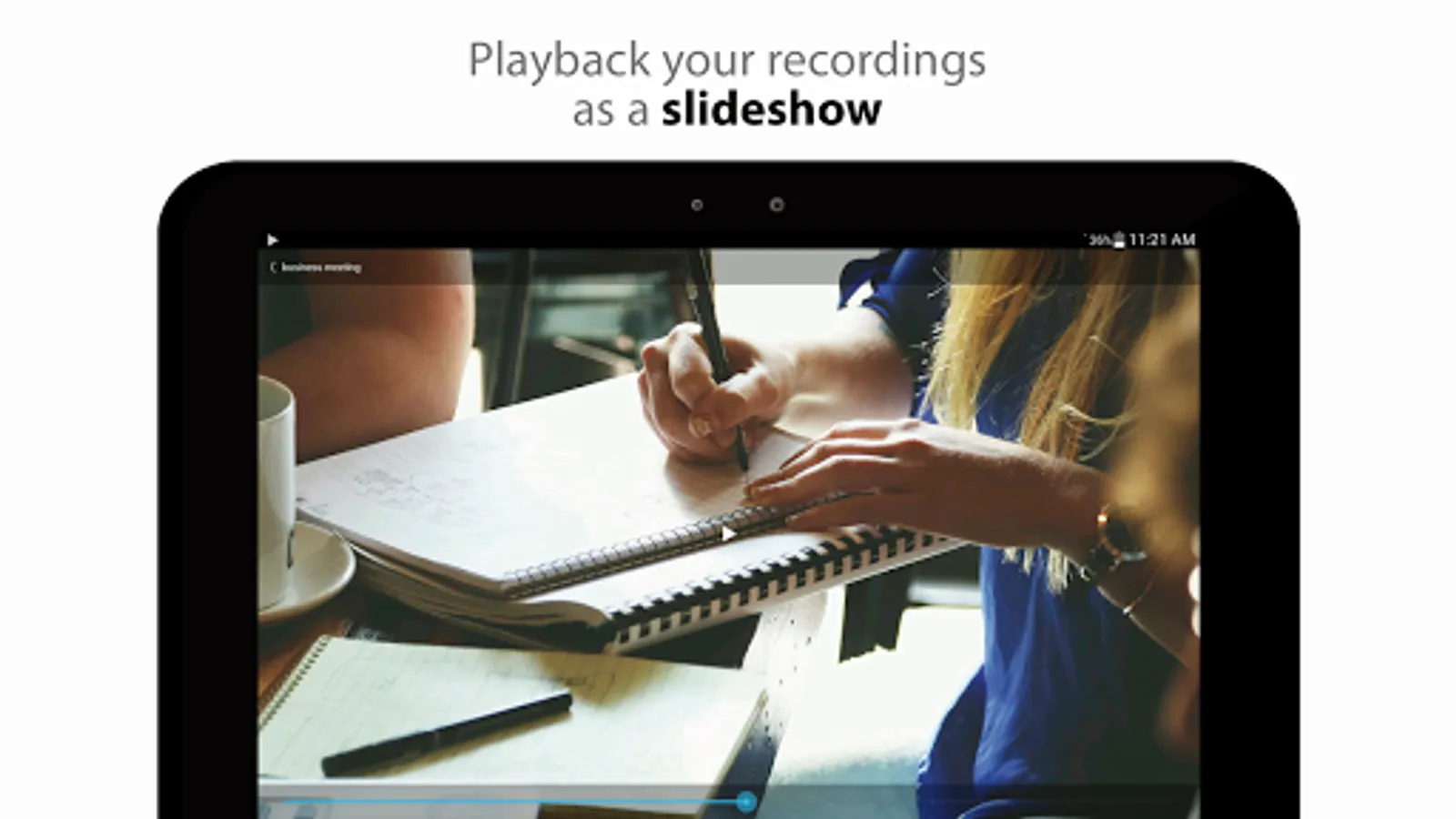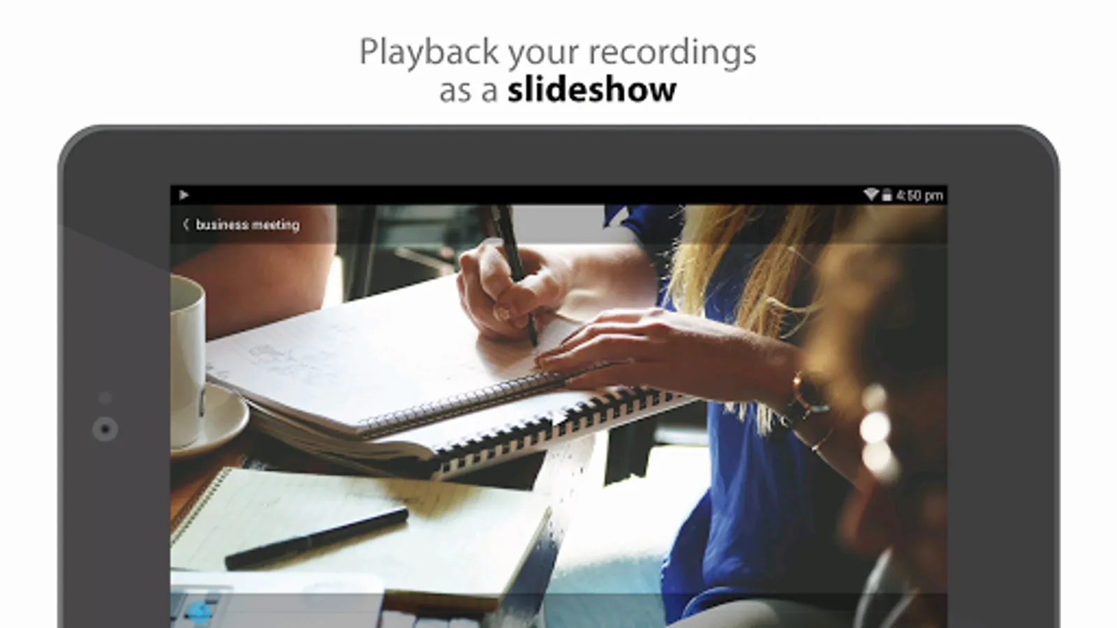 This is not just a voice recorder, it is an intelligent voice recorder. It is the only app that lets you automatically add images of presentation slides, notes, whiteboard sessions and more to a recording to make it richer.