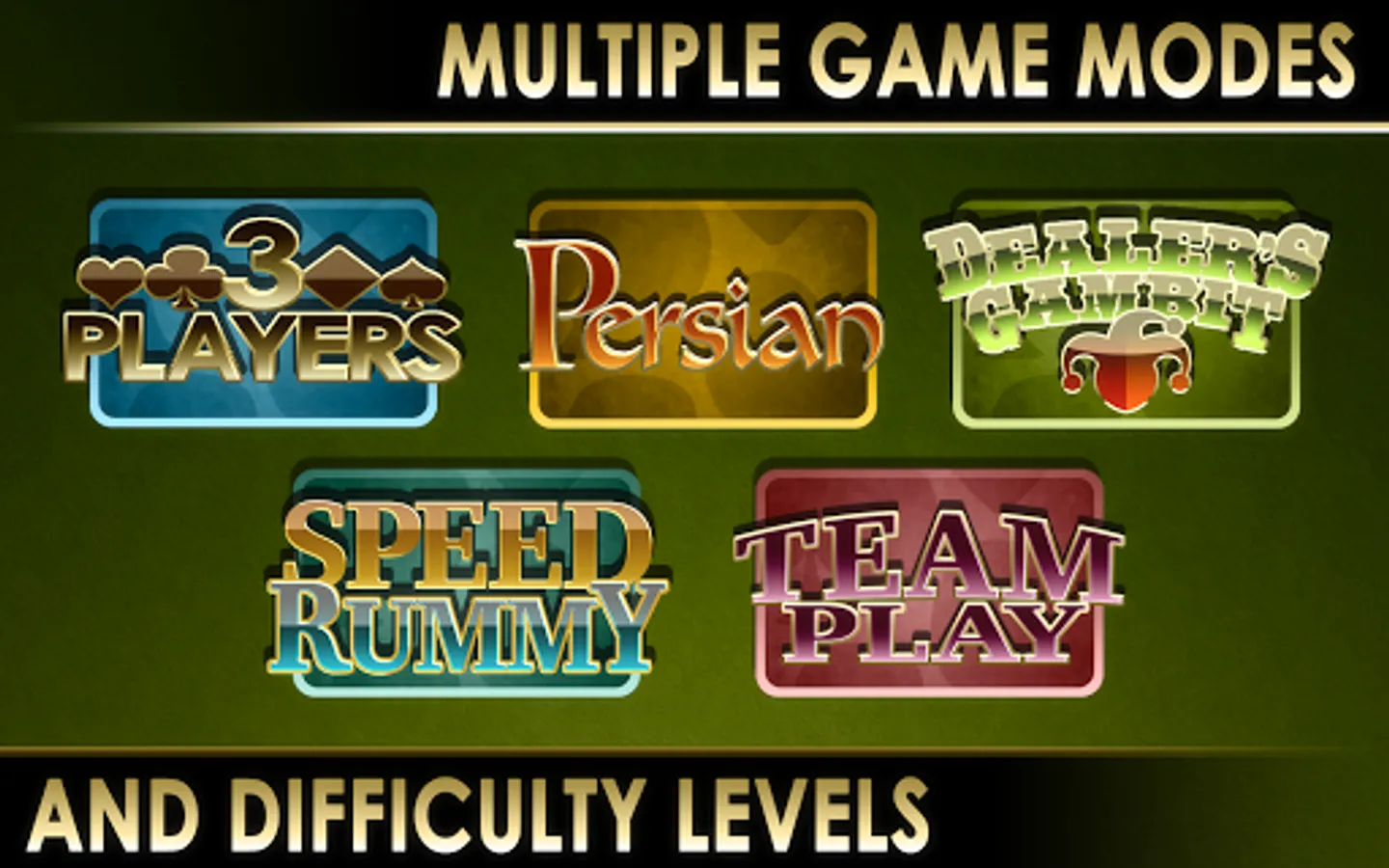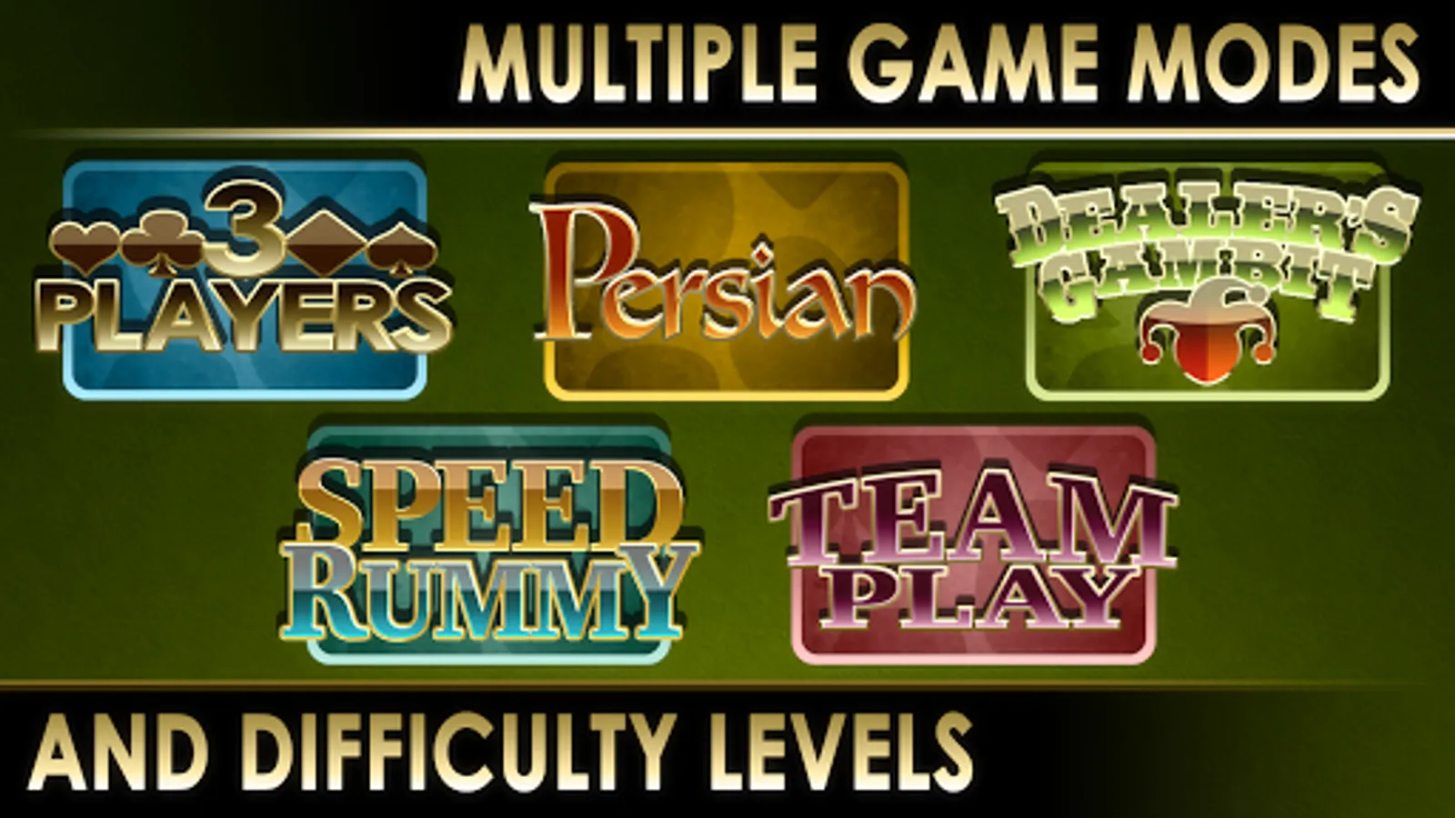 • 6 game modes: Regular, 3-Player, Speed Rummy, Team Play, Persian and Dealer's Gambit.