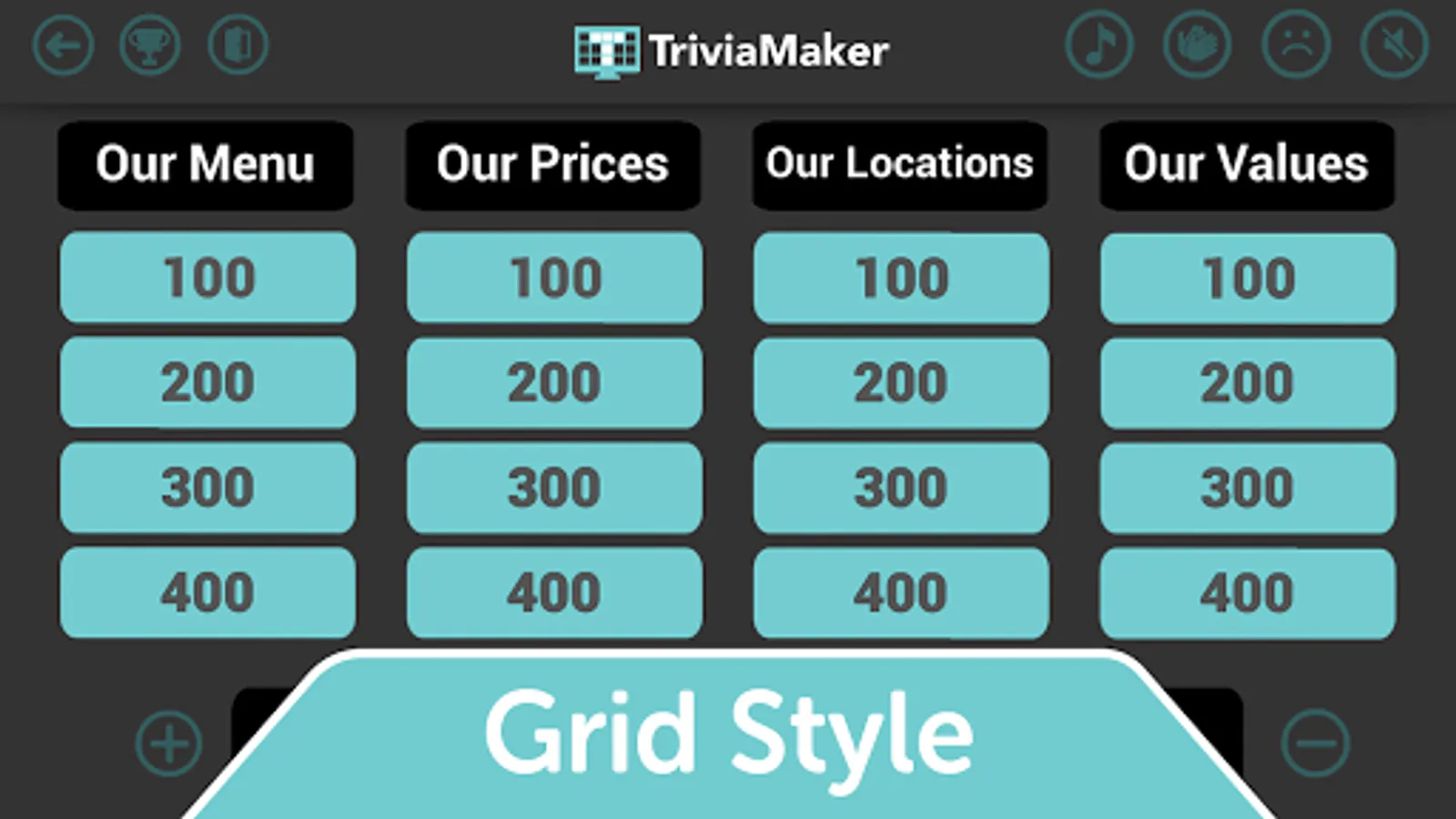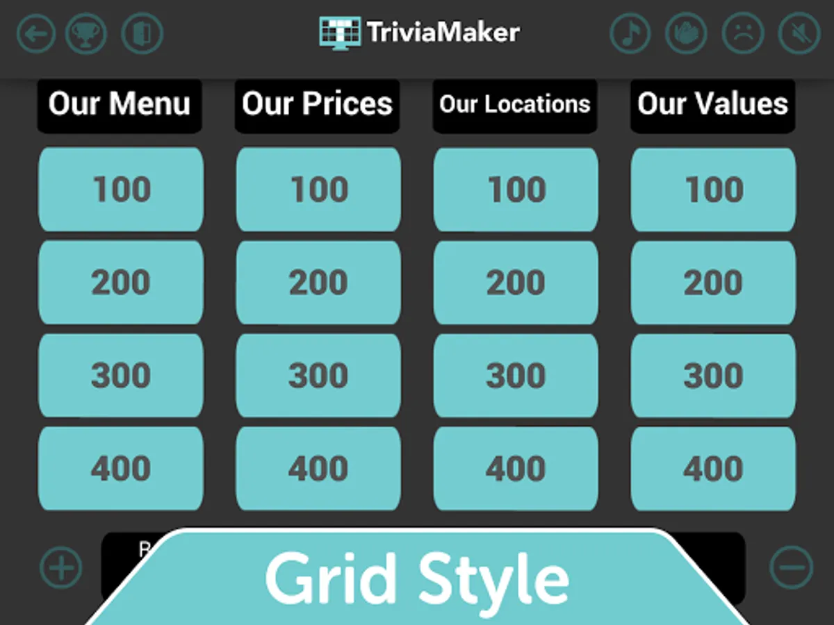 Trivia Maker is an exciting "build your own quiz / gameshow" app. The layout of the board is a lot like the game Jeopardy, Family Feud, Who Wants to be a Millionaire, or other trivia game shows.