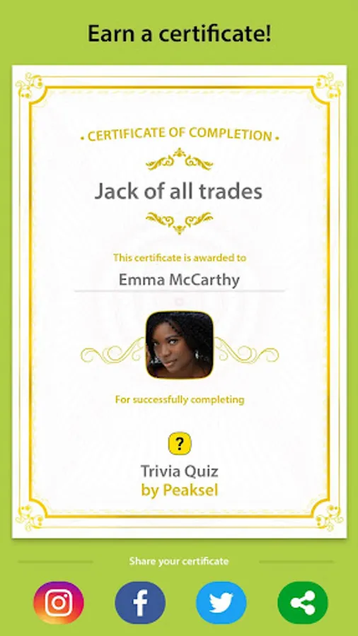 - CERTIFICATE - you get it once you answer all general knowledge quiz questions