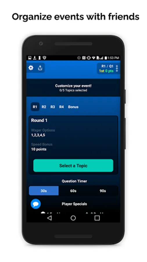 You and 7 of your closest friends can hop into an event anytime for free. You'll select topics, customize scoring, and reward specials. Playing remotely? Join the group video chat to brag to everyone about how much useless knowledge you have.