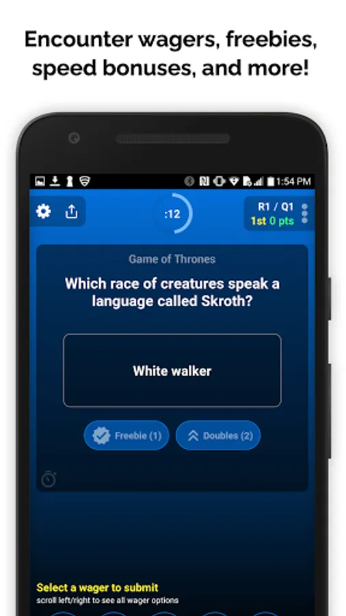 Trivnow supports wager options, speed bonuses, free wagers, freebies, and much more! You'll never find 2 events on Trivnow with the same format. Hosts and organizers spin up unique trivia games with settings influenced by their community of players.