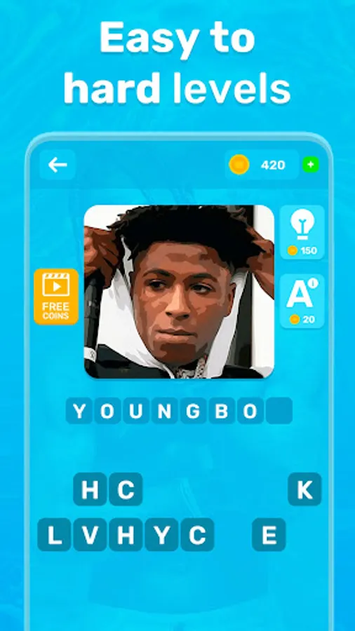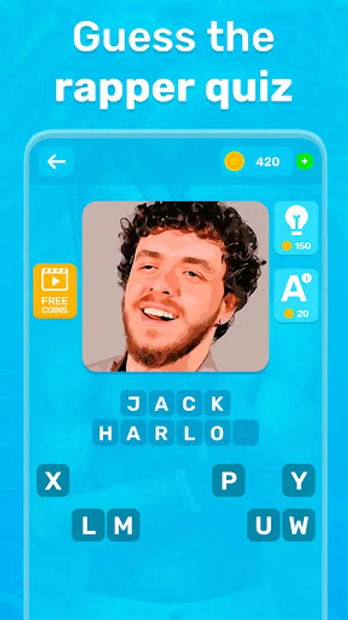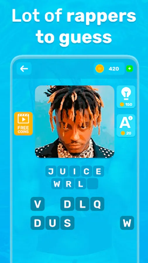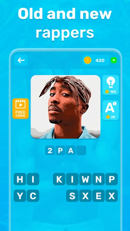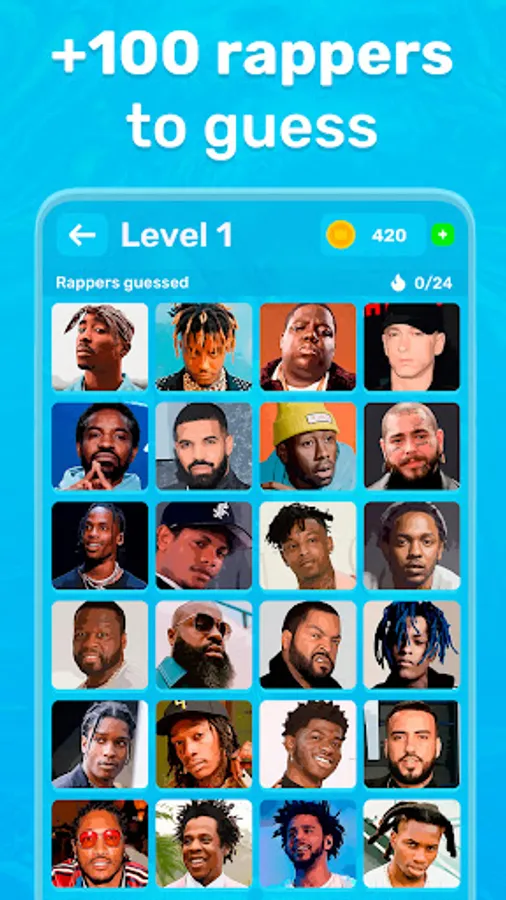 The image of the rapper will appear on the screen, enter the letters to guess the rapper. Touch the letters to form the word. That's not all, you can use the hints to get help in the most difficult levels of guess the rapper.