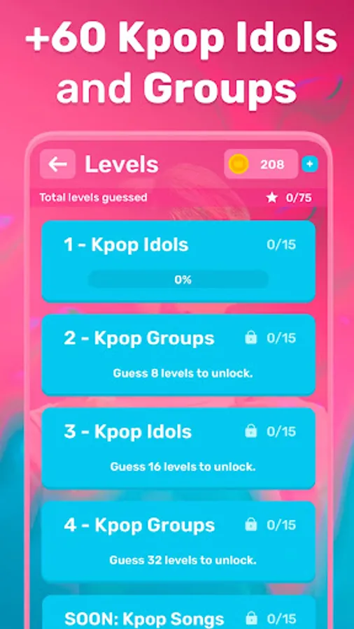 - Guess the kpop idols songs and groups to earn coins.