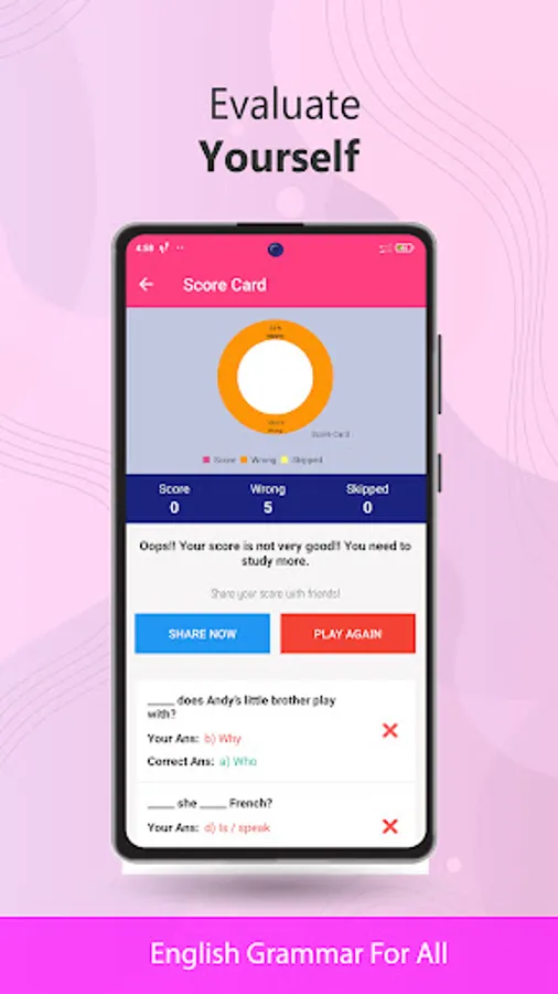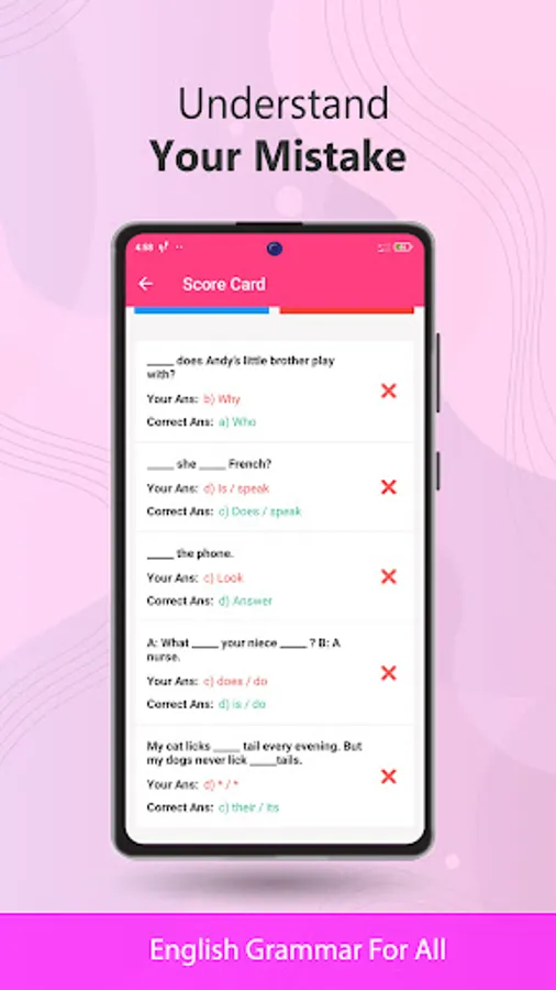 Our team designed this English grammar app to follow the best English grammar book with English grammar practice, English grammar quizzes, English grammar exercises, and complete new English grammar tests. If you have this English Grammar For All app, then you don't need an English grammar correction app. So, check your English grammar and send us English grammar notes if you fall into any kind of trouble.