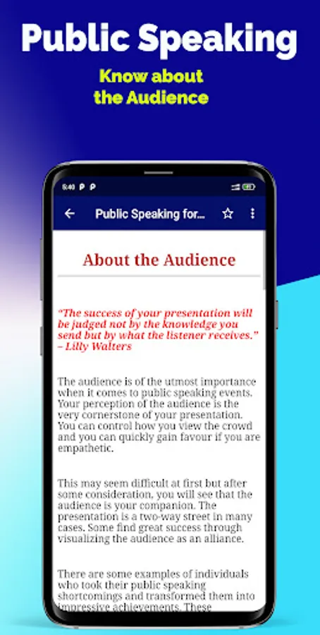 Public speaking app for beginners to advanced levels learners. You might have speaking skills in English but these English-speaking skills won't help you when you want to deliver your speaking in front of people. That's why you need to learn the way of public speaking and you have to gain Public Speaking skills.