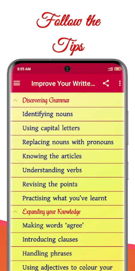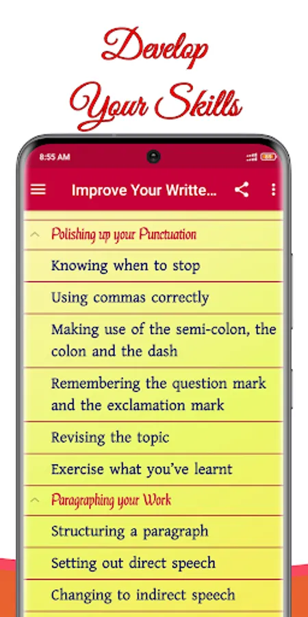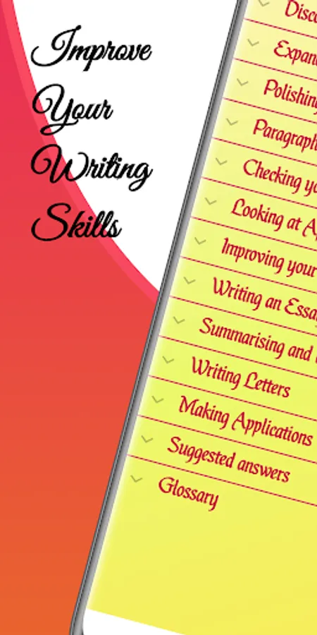 We divide this English writing improvement app into 13 sections to understand all the writing skills. This 13 section included the following topics: -