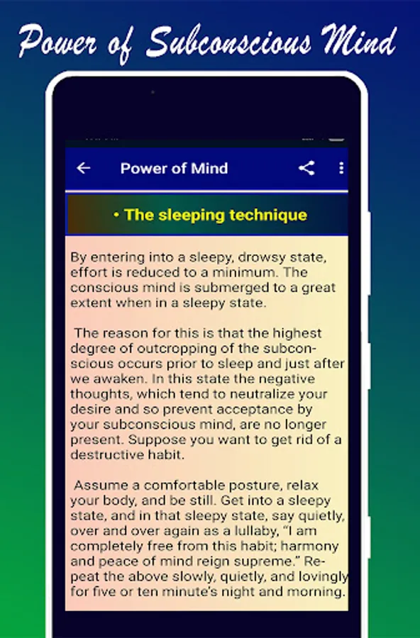The power of your mind COULD BE tremendous if you know your subconscious mind and how the subconscious mind works without your conscious. This Power of subconscious mind app allows mind power test with subconscious mind sleep.