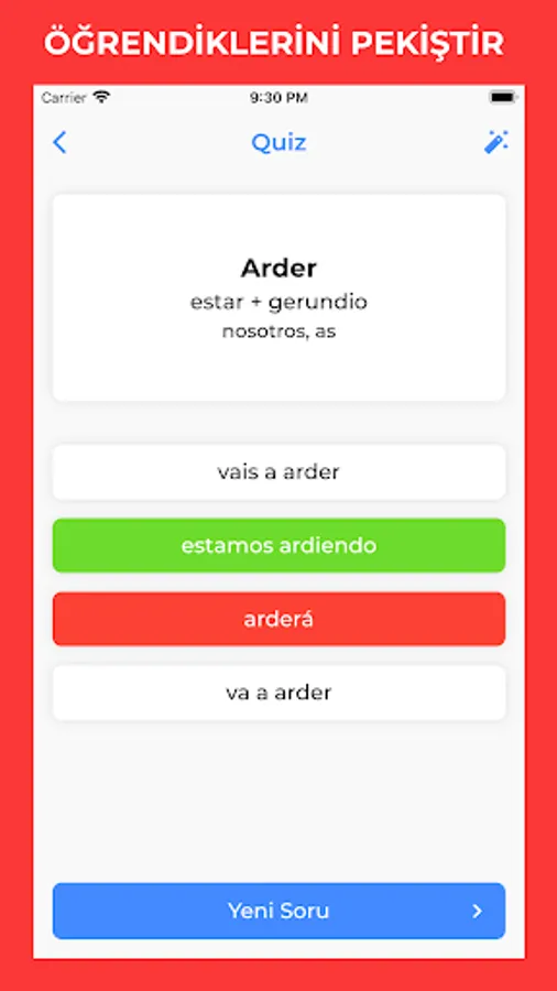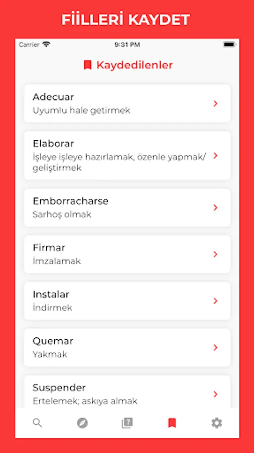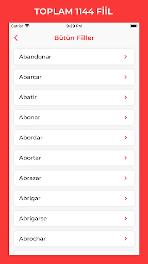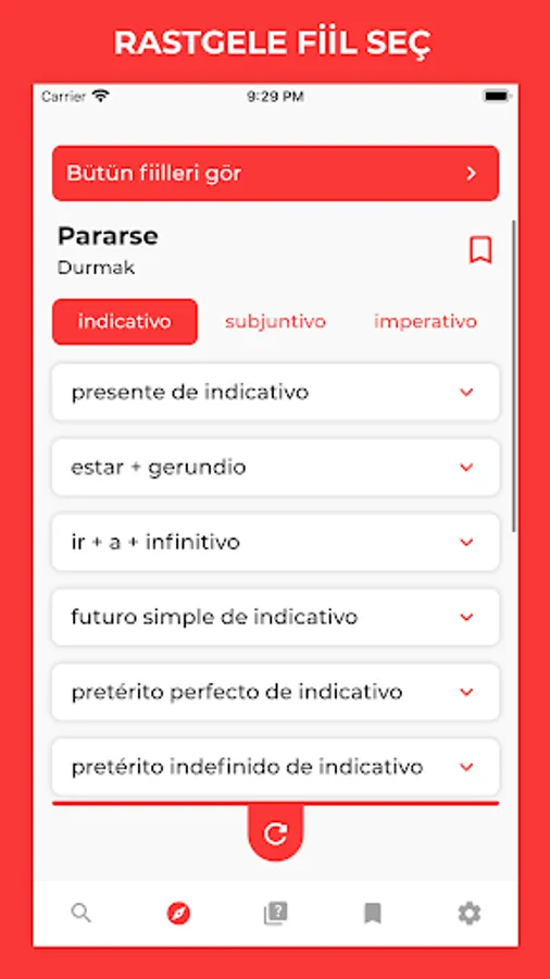 It includes the conjugation of 21 different forms of 1144 verbs according to personal types. It features search, save, see random verbs and quiz. It was designed as a tool that can be used for different learning methods.