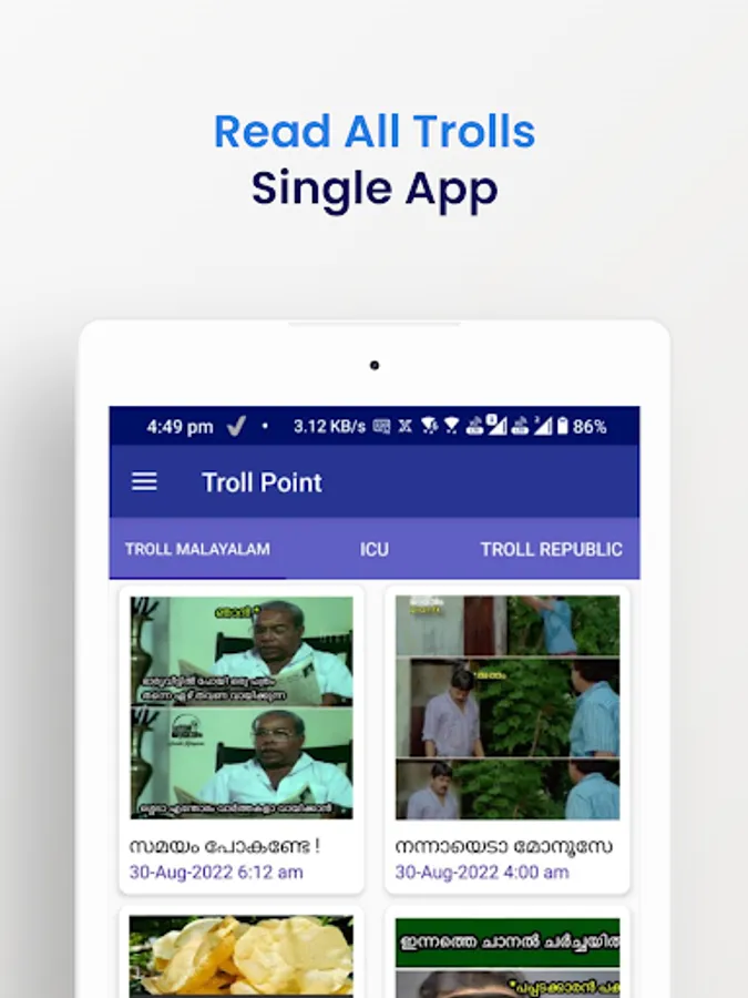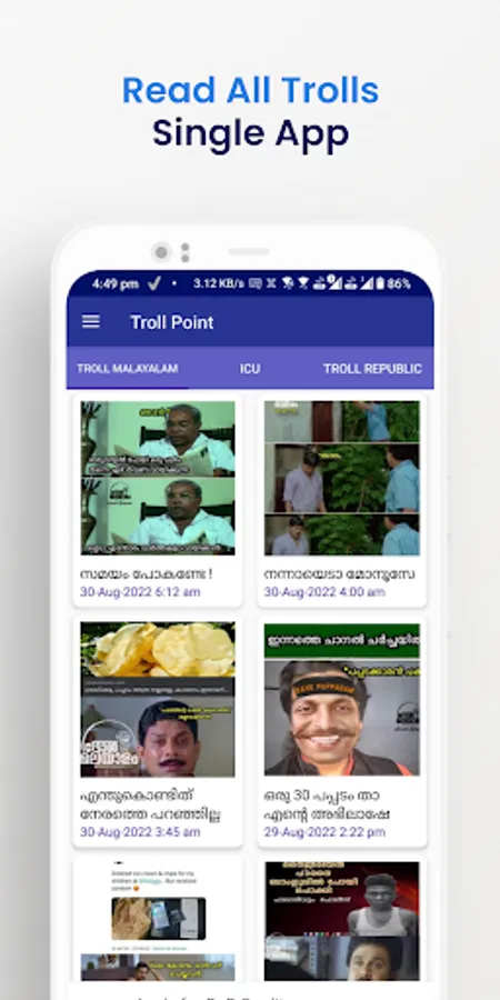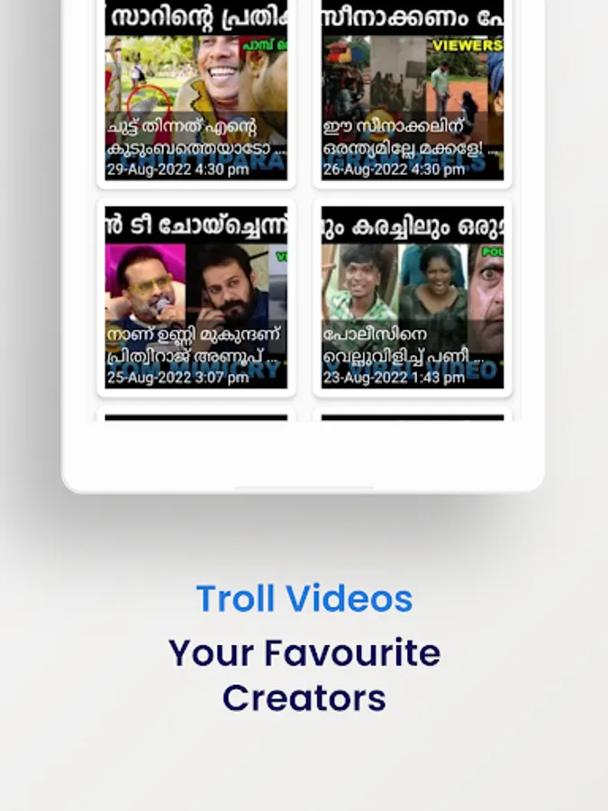Welcome to the world of unlimited trolls. Here you can enjoy trolls in real-time as they are published from multiple known Malayalam Troll Platforms. Not just images, TrollPoint provides you latest troll videos from your favorite creators so that you can stay entertained 24x7 !