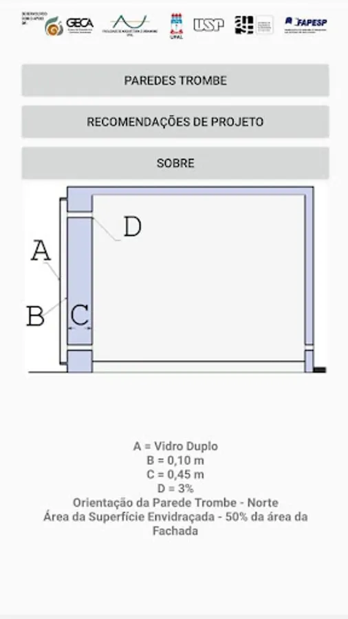 This application is part of the Doctoral Thesis of the Architect and Urban Planner Fernando Antonio de Melo Sá Cavalcanti, under the guidance of Professor Dra Rosana Maria Caram and defended at the Institute of Architecture and Urbanism (IAU) of the University of São Paulo (USP) with the title : TROMBE WALLS IN BRAZIL: Analysis of the potential use for heating and cooling.