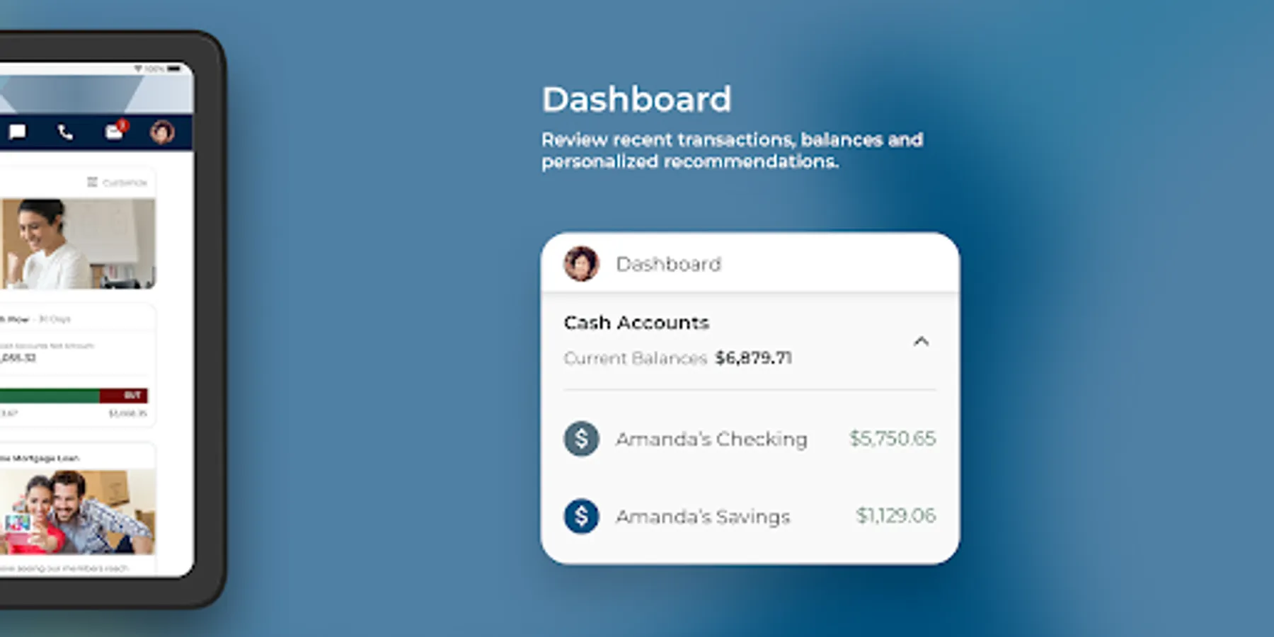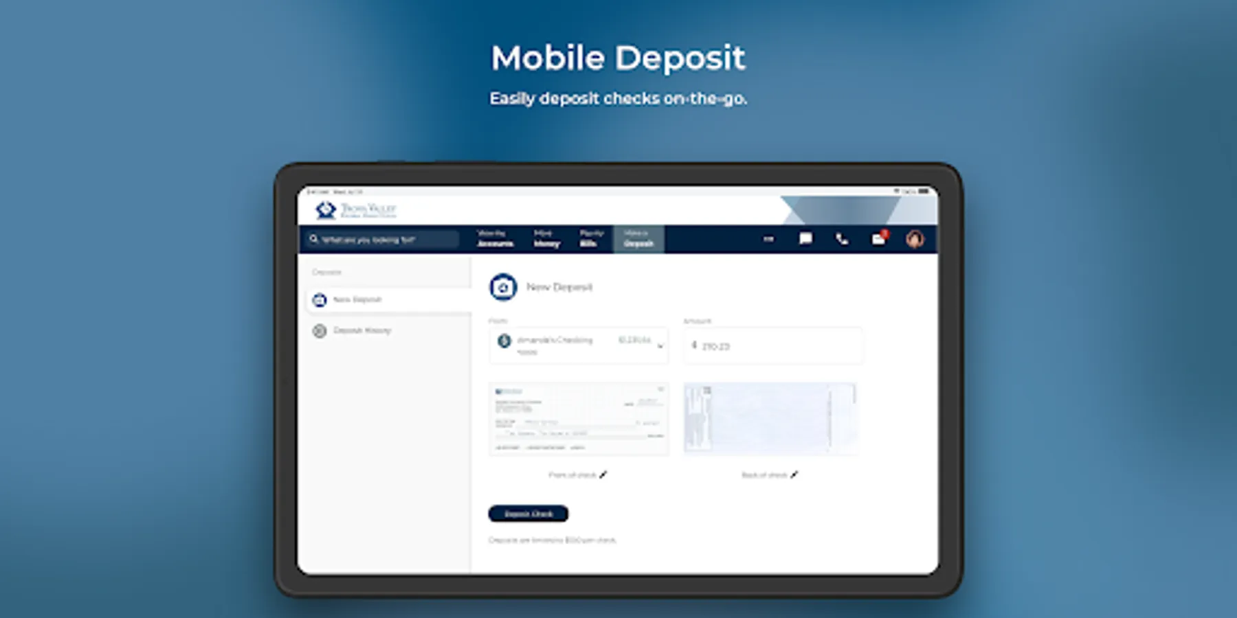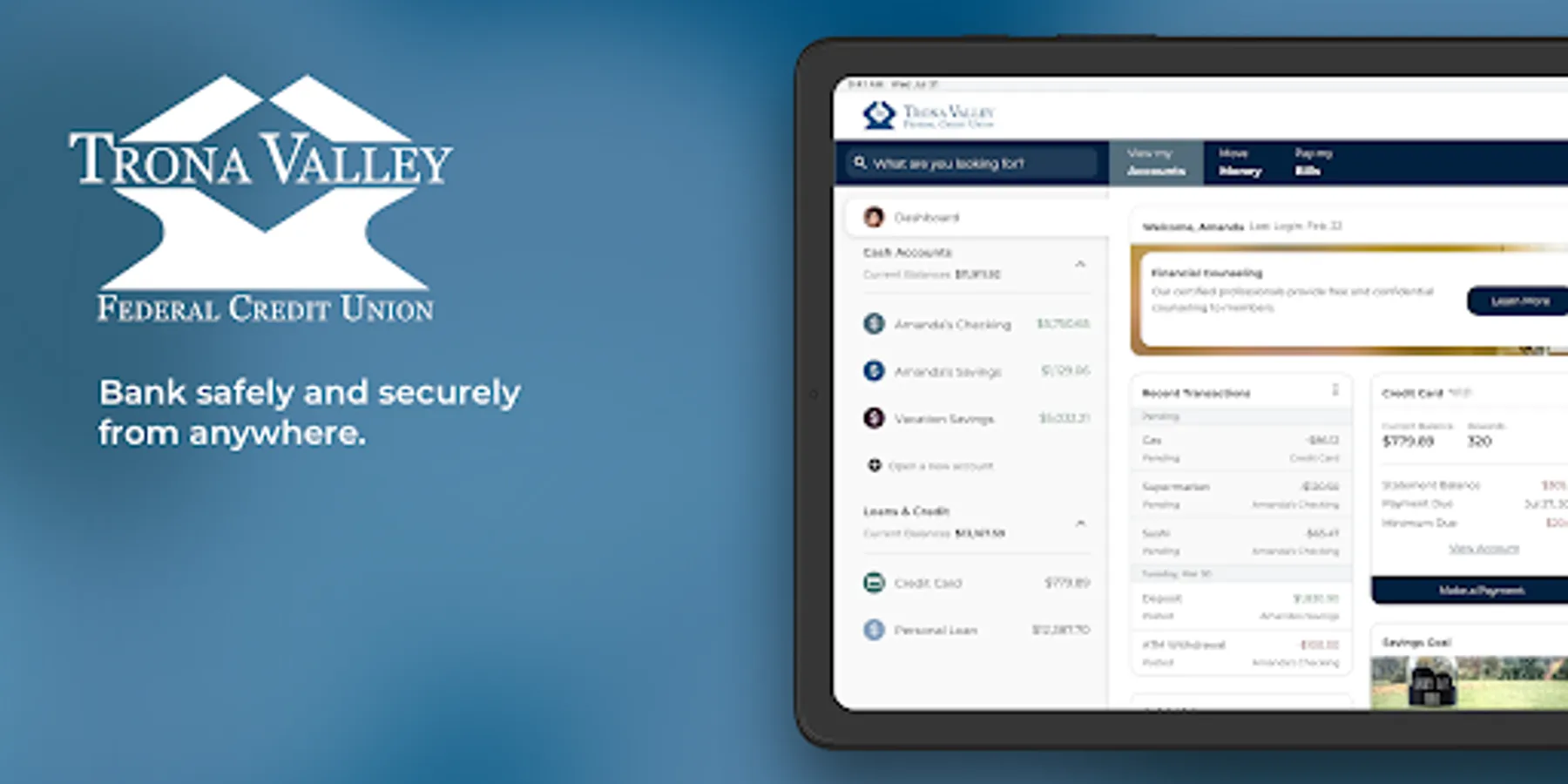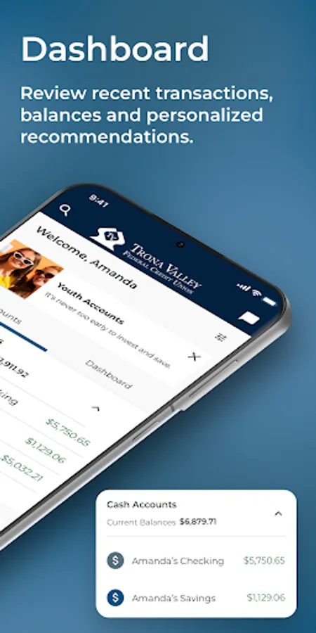 Dashboard - Manage all of your Trona Valley FCU accounts in one easy to view dashboard. View available funds, the progress of savings goals, upcoming payments, how much you’ve deposited, and personal recommendations all in one simple and easy to read screen.
