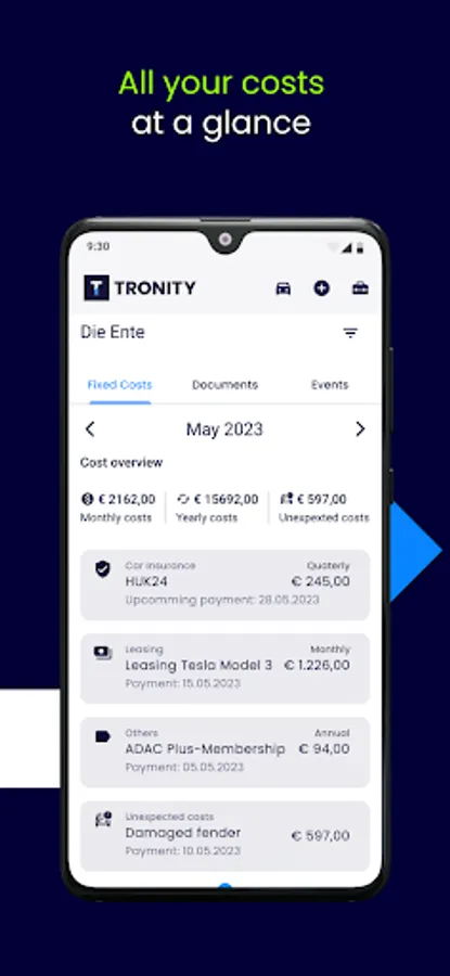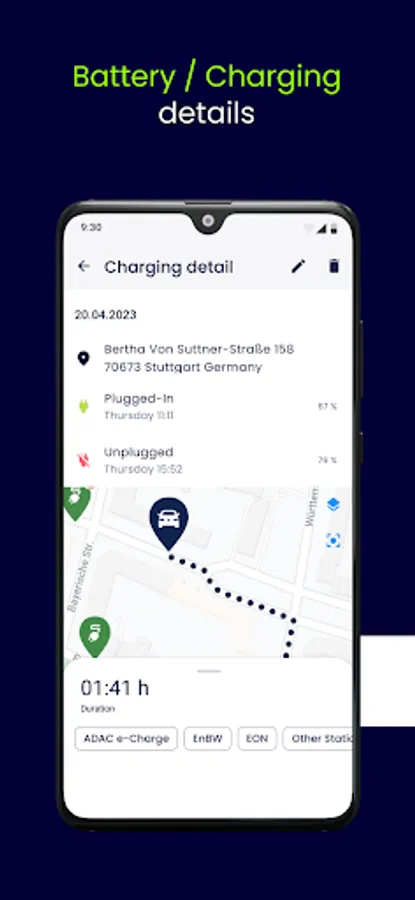 - Cost Management: Your overview of all your charging and fixed costs. The integrated charging diary ensures complete documentation of all charging stops. In your personal “glove box” you always have your contracts, receipts and appointments at hand.