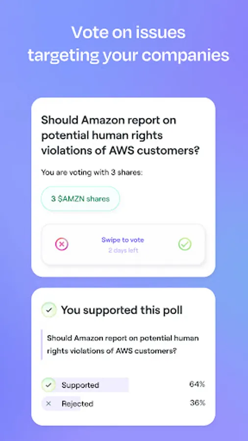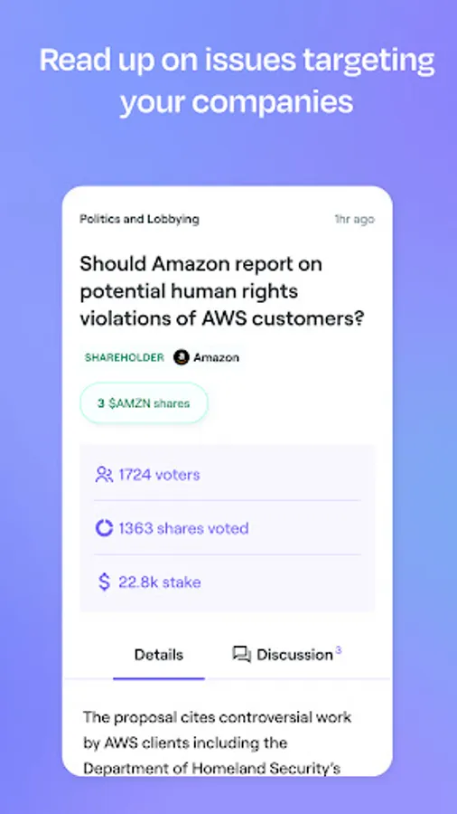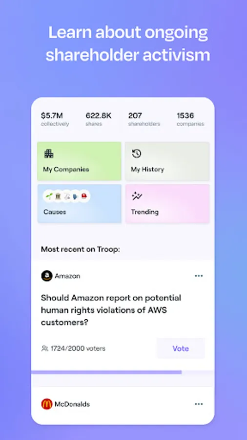 Troop: the simplest way to participate in shareholder activism. Propose, discuss, and vote on resolutions, coordinate capital, and take strategic action to address the biggest issues of our time—all in one secure, user-friendly app. With over 27,000 shares representing $1.2M (and growing) worth of collective voting power, Troop makes activism easy for everyday investors, using the shares you already own.