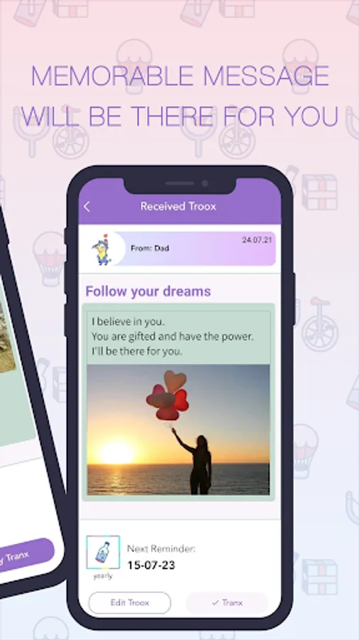 Troox bridges the gap. Troox is a treasure box of feelings, insights, memories and other meaningful messages shared between you and yourself, and the people that matter most. Instead of scrolling through endless messages, Troox dedicates itself to saving only your gems. Best of all, Troox reminds you of the messages that matter most, so they’re anchored to your life.