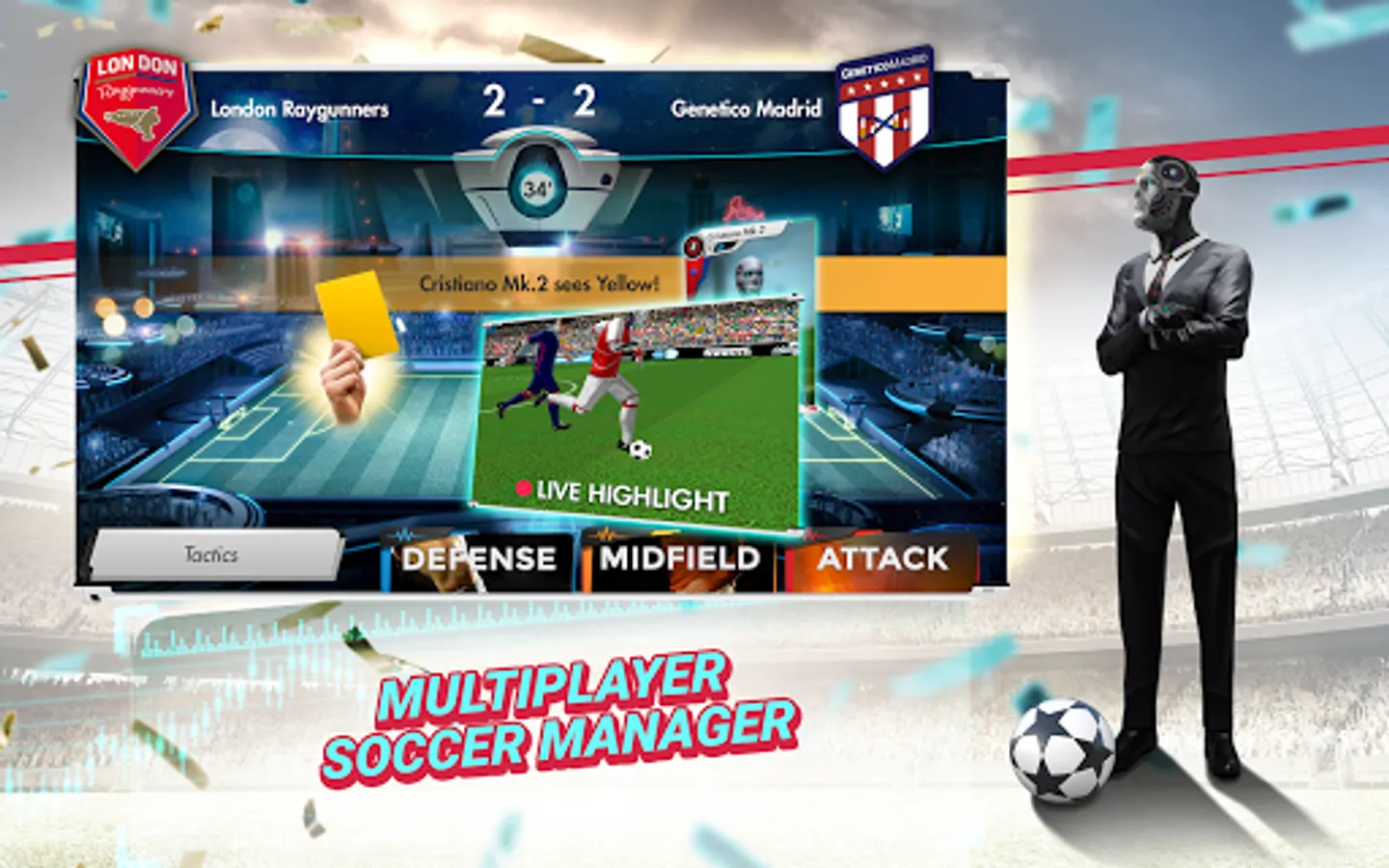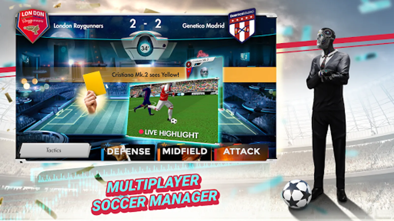 You are the heir to a Futuball club and DNA samples from the old world’s biggest football legends. You must use this to build and manage a team of the eleven most monstrous and efficient robots ever created in a lab to become the best soccer manager of the future!