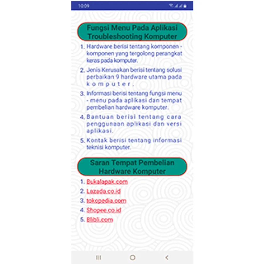 In this application discusses the damage - damage that often occurs in your computer hardware based on the characteristics encountered and repair solutions and suggestions where to buy components that are experiencing problems. other than that, it contains understanding of hardware, damage to computers, information, assistance, contact programmers who can be contacted.