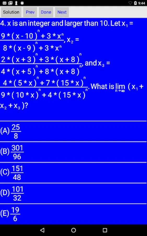 This app has lots of math problems about equations, exponents, functions, logarithms, polynomials, and sequences. Some are difficult. Please try to analyze and resolve them. Analysis in the app will help you understand how to resolve them. Subscription is required to view analysis. But if you study hard, you might be able to study analysis without a subscription. Please see user manual.