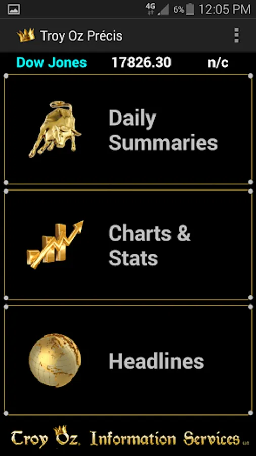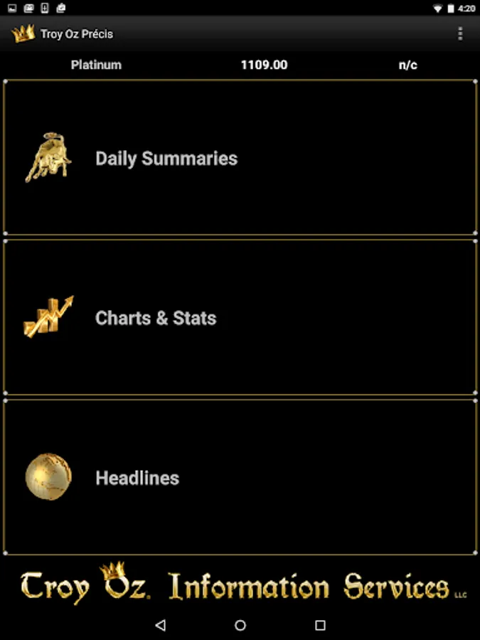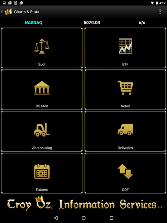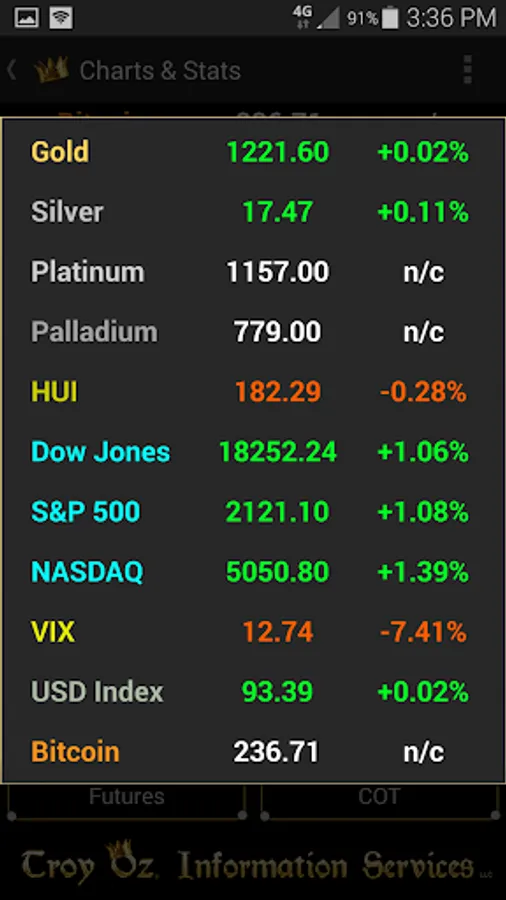 ★ Marquee scrolling through pricing of gold, silver, platinum, palladium, HUI, DOW, S&P500, NASDAQ, VIX, US Dollar Index & Bitcoin. (Note: Price quotes are slightly delayed.) Tap on the marquee to bring up a screen listing of all commodities/indices and their respective pricing data.