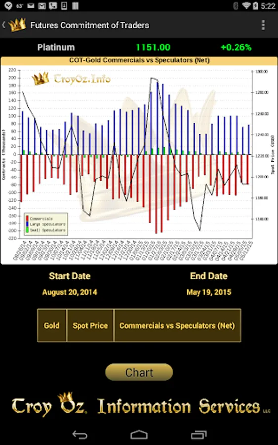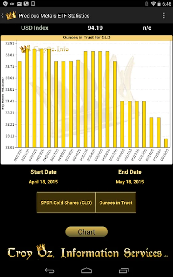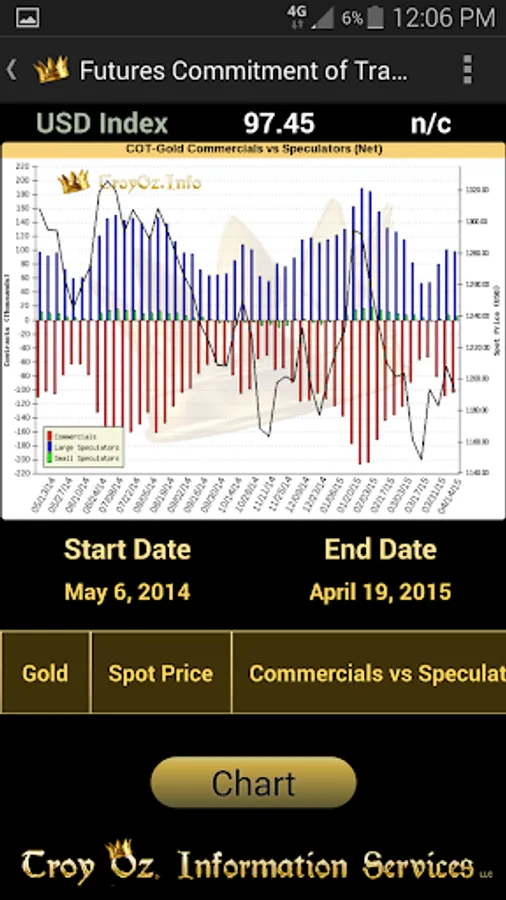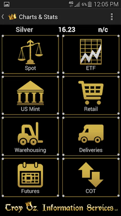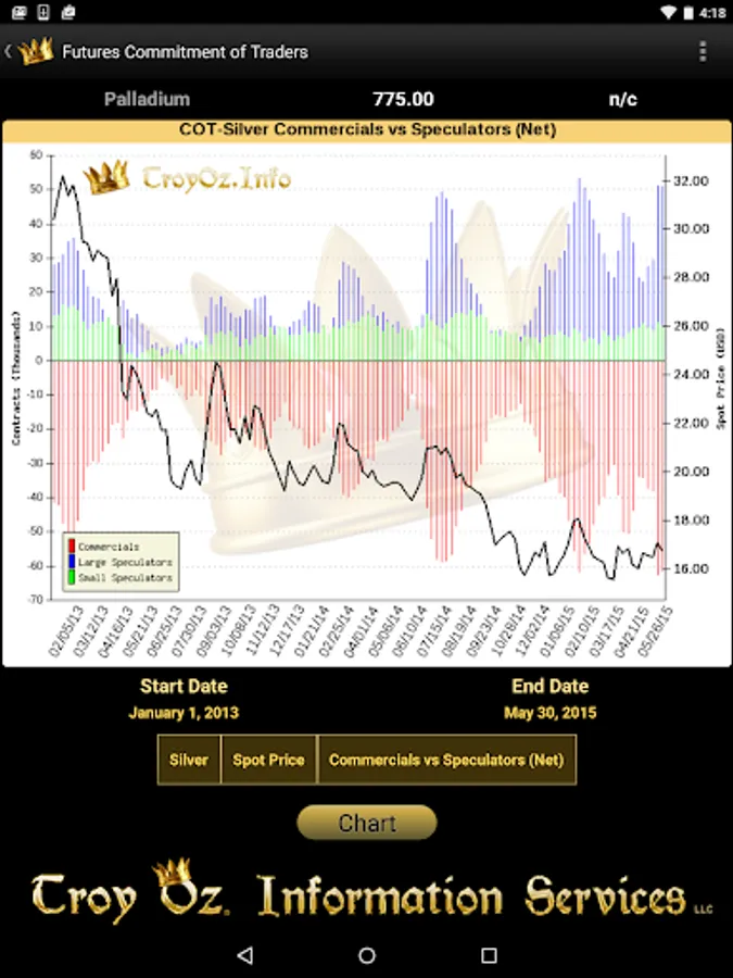 ★ Analyze the statistical information by using the chart interfaces. Easily graph the historical perspectives for spot prices, ETF statistics, US Mint sales, Retail inventories & availability, Warehousing & Deliveries related to the Futures markets & Regulatory reporting via Commitment of Traders (COT). Select start and end dates to limit the chart data boundaries. Each chart category has its own parameters, which allow specific details to be graphed.