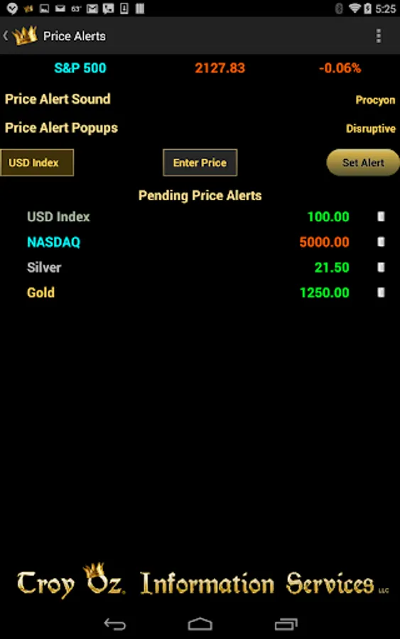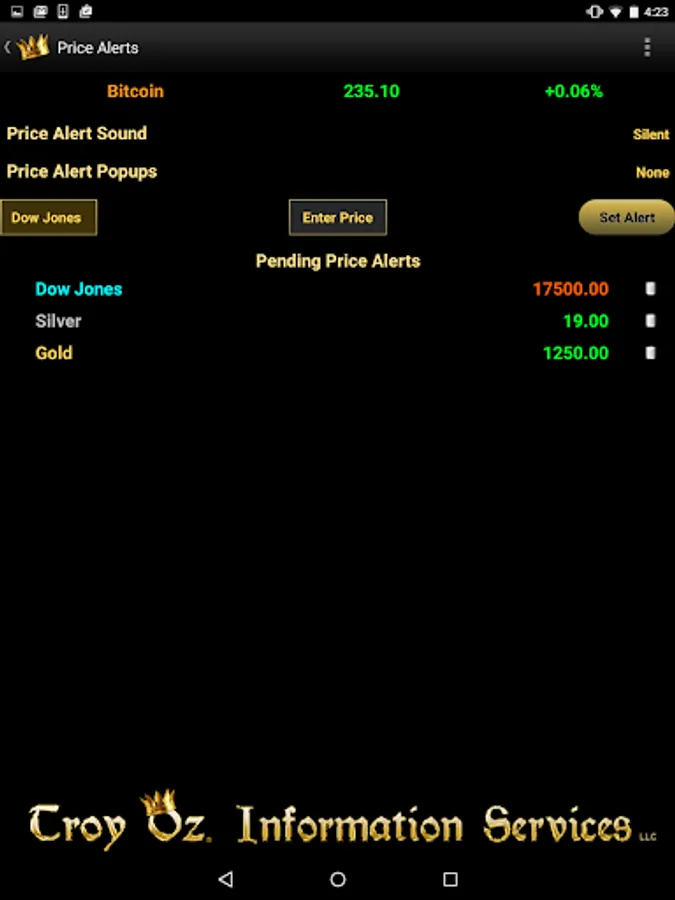 ★ Set price alerts on any of the above commodities/indices. Alerts can be set to be received in 3 different pop-up modes: None, Soft & Disruptive. Alert tones can be set to any tone. The home screen icon displays the number of unacknowledged price alerts that have been received (see installation notes).