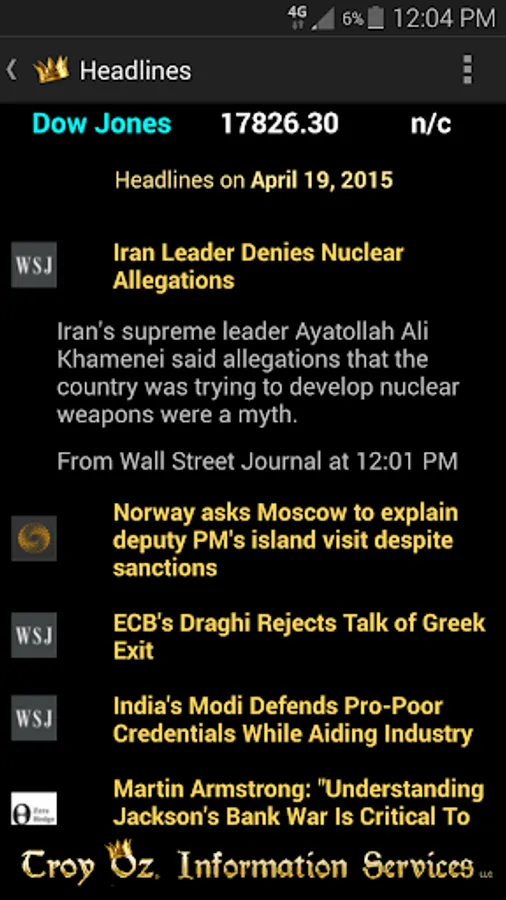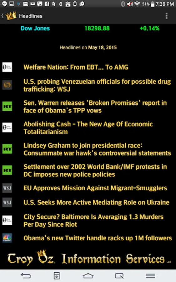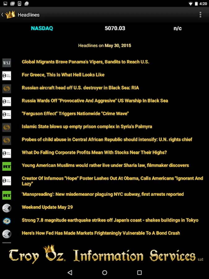 ★ News feed reveals both main-stream and alternative sources for headline events for the current day. Tap on a headline to read a brief description of the news item. Tap on the item to be directed to the full story using the web browser. Historical headlines available by date as well. Simply tap on the header to choose the date or swipe the screen backwards to get the previous day's headlines.