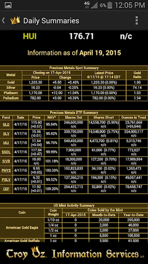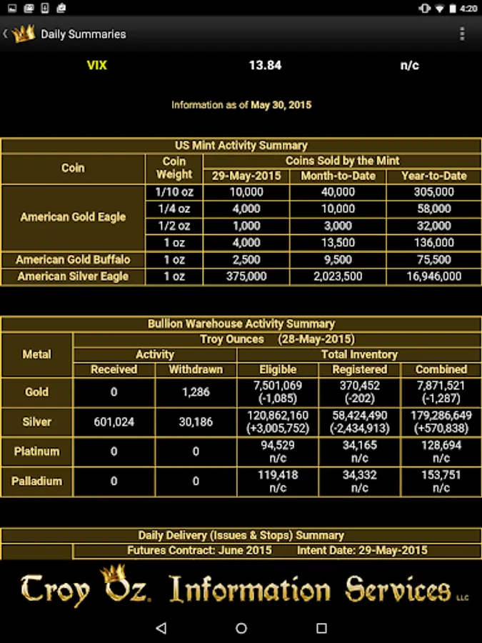★ Summary tables indicate performance & statistics for the Spot Market, ETFs, US Mint, Retail Perspectives, Commodity Futures, Warehousing, Daily Delivery and even COT analysis. Tables sorted by date, which allows easy navigation by selecting specific dates by tapping on the header or swiping the screen backwards to get previous day's data. Use the copy/paste functionality to take personal notes or send data to associates or friends.