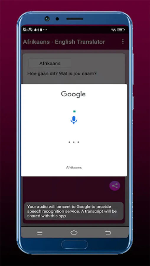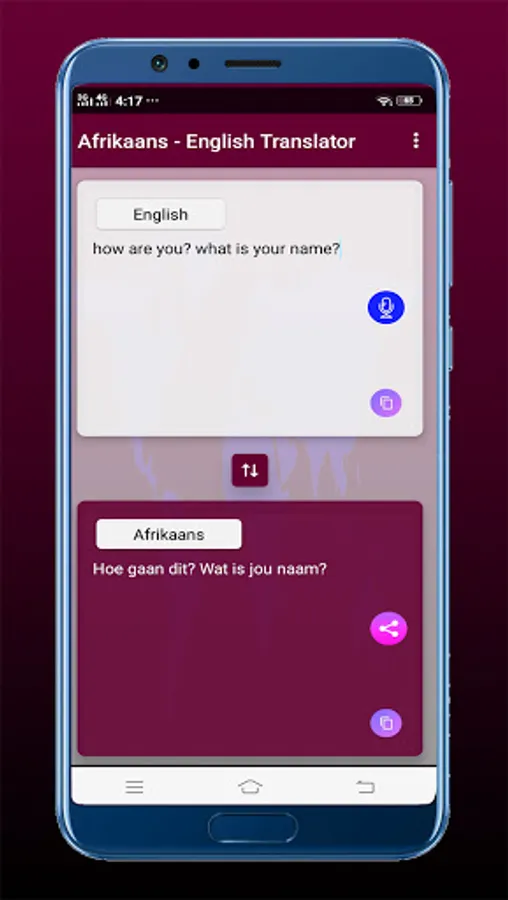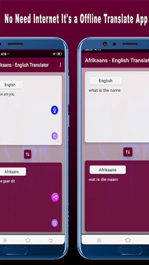 This is 100 % FREE and Offline Afrikaans to English & English to Afrikaans Translate app. This app will be very useful for people. If you are a student, tourist or traveler, this will help you learn the language! This is very Simple and user-friendly interface. There have many more Features available in this app.