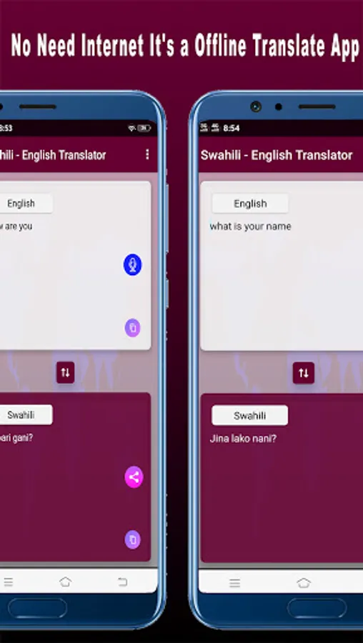 This is 100 % FREE and Offline Swahili to English & English to Swahili Translate app. This app will be very useful for people. If you are a student, tourist or traveler, this will help you learn the language! This is very Simple and user-friendly interface. There have many more Features available in this app.