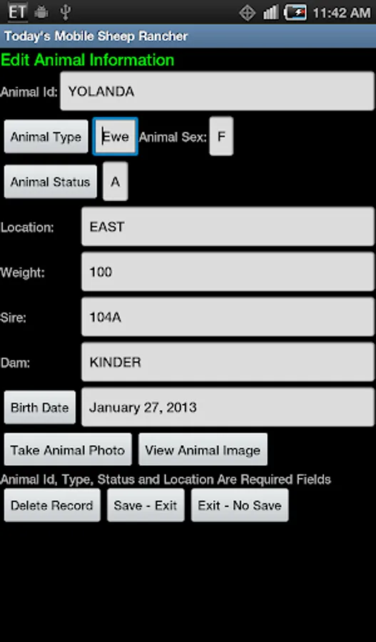 Add-Edit Records – Shows list of previously entered animals. Select and animal to work with or enter a new animal store animal id, type of animal, status of animal, location, weight, sire, dam, and date of birth, you can also record a photo for the animal and have it ready for viewing from within the record
