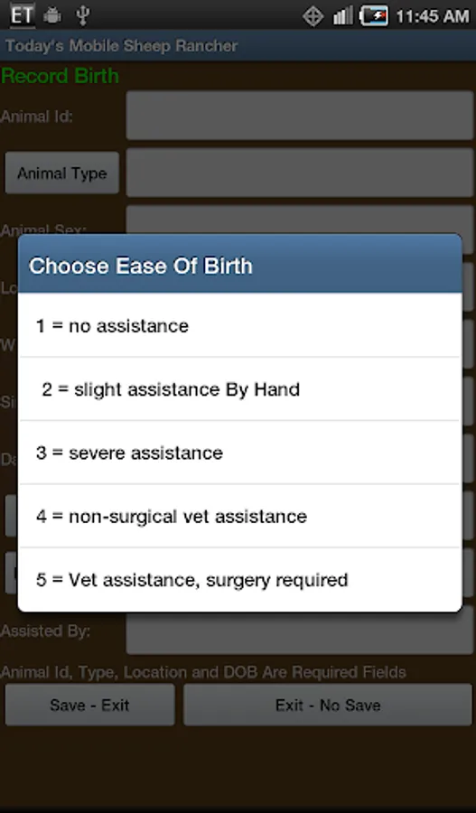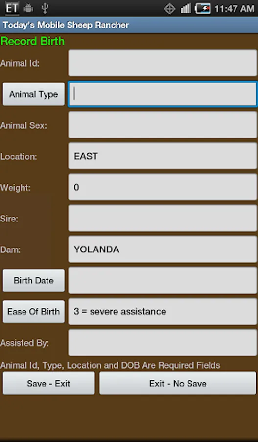 Record Births – Select dam from list of existing animals, enter birth animal, sex of newborn, weight of newborn and date born, sire, plus ability to record ease of birth