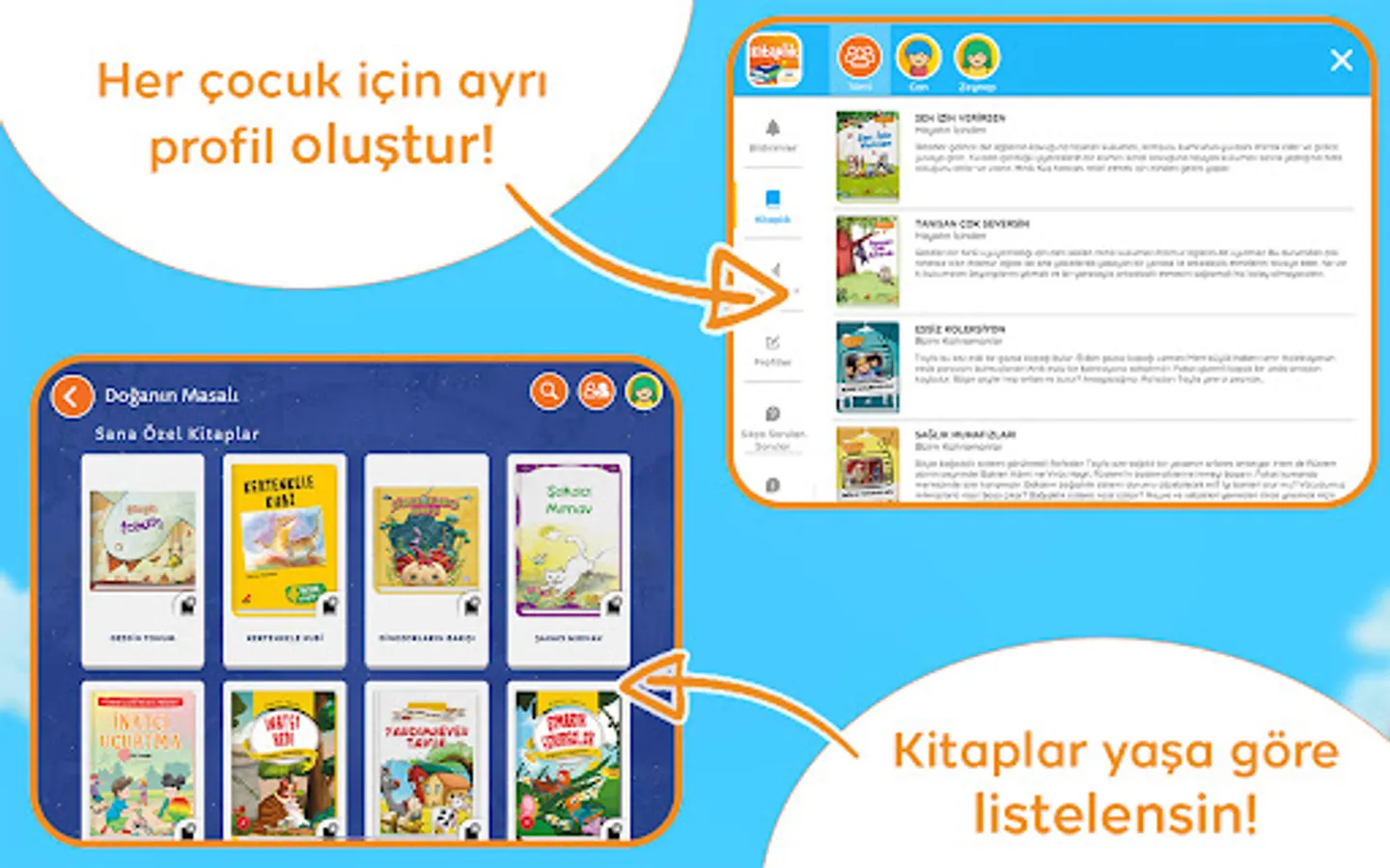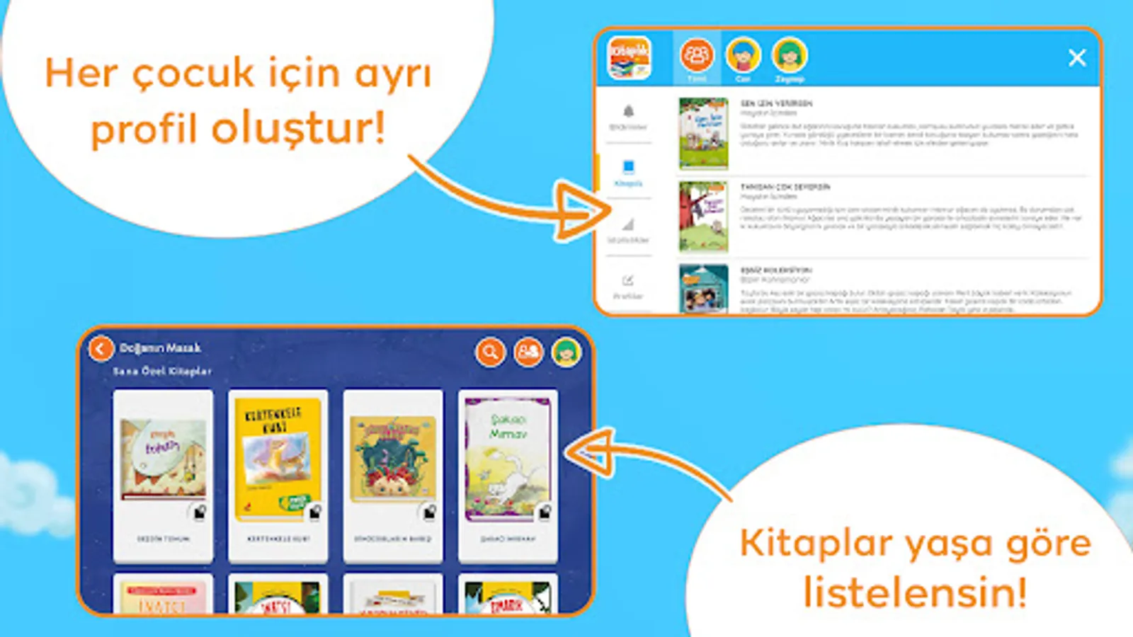 With a free membership, you can create a separate profile for each child from the "Parent Panel" and access the books listed specifically for the age of the child. You can continue the book from where you left off thanks to the separator feature that becomes active with membership.