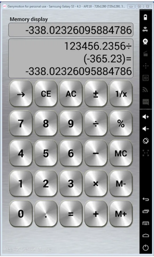 Simple classic calculator with memory. Analogue of an ordinary office desktop calculator. Executes simple arithmetic actions, divides "1" by the entered number, calculates percents.