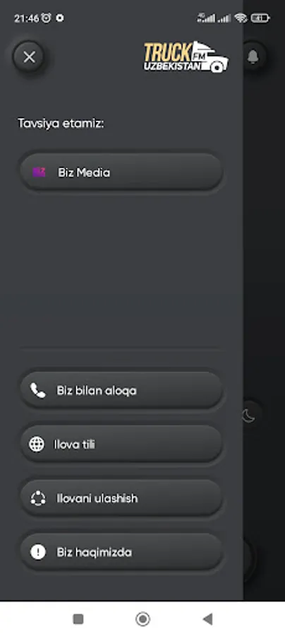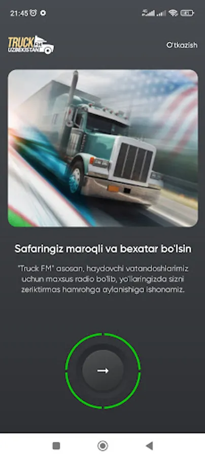 "Truck FM" radiokanali 2023-yil boshida tashkil etilgan bo'lib, xorijdagi vatandoshlarimiz, asosan trak haydovchilari uchun mo'ljallangan. Asosiy maqsad ham aynan ularni safar davomida zeriktirib qo'ymaslik, sog'ingan kuy-qo'shiqlarini yangratish va turli eshittirishlar orqali ularning ham hayotini ommaga kengroq yoritish, interaktivlikni yo'lga qo'yib, ularning ham fikrlarini tinglash hisoblanadi