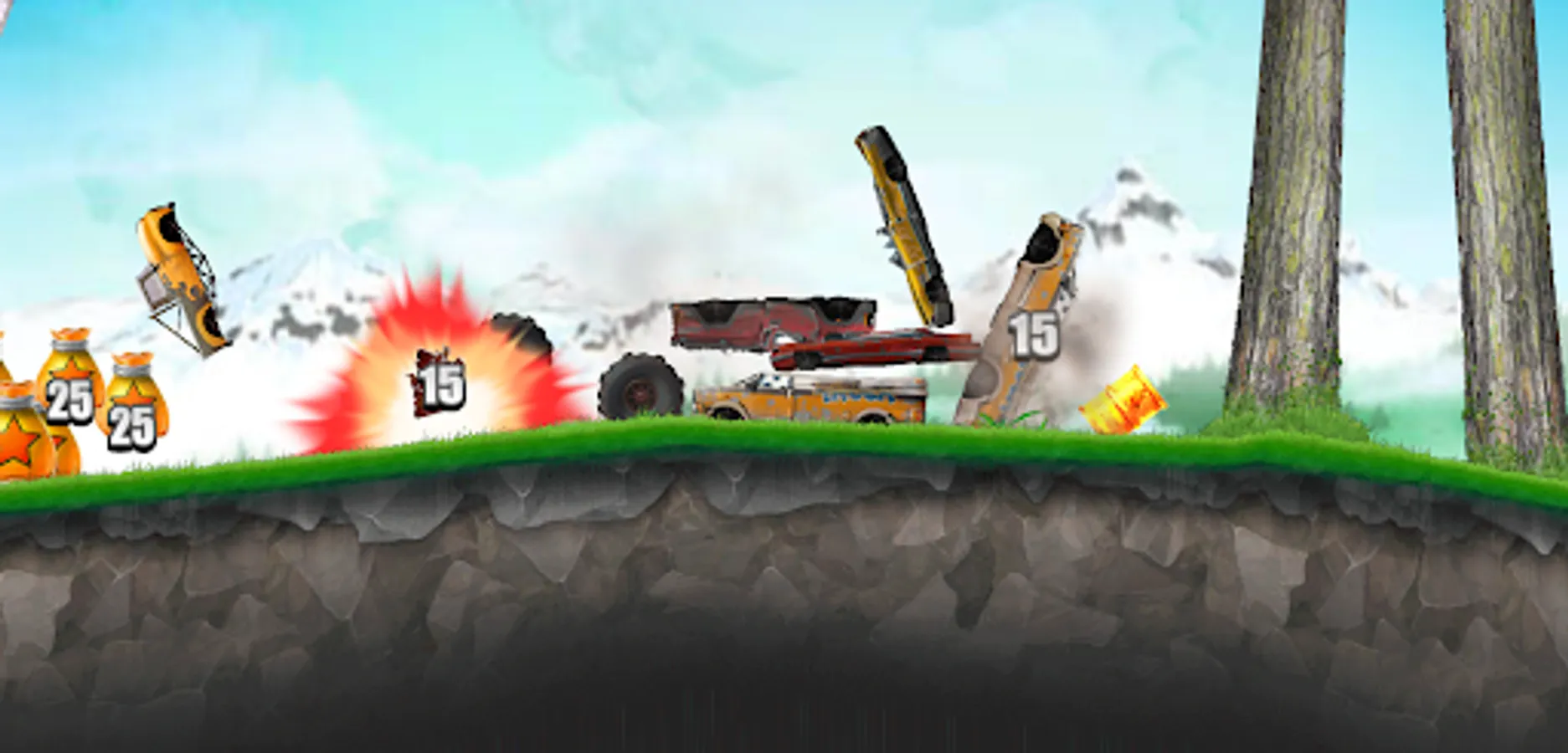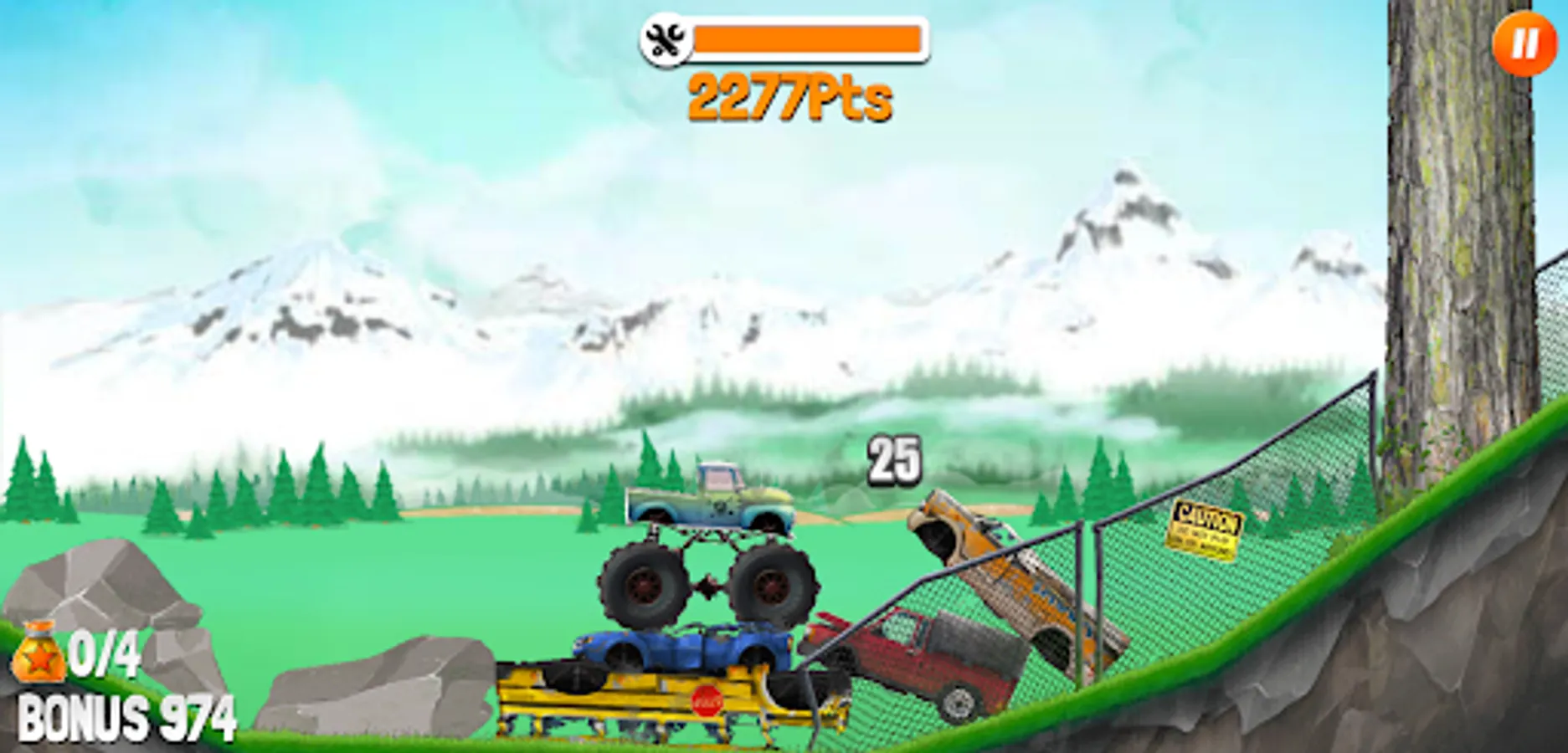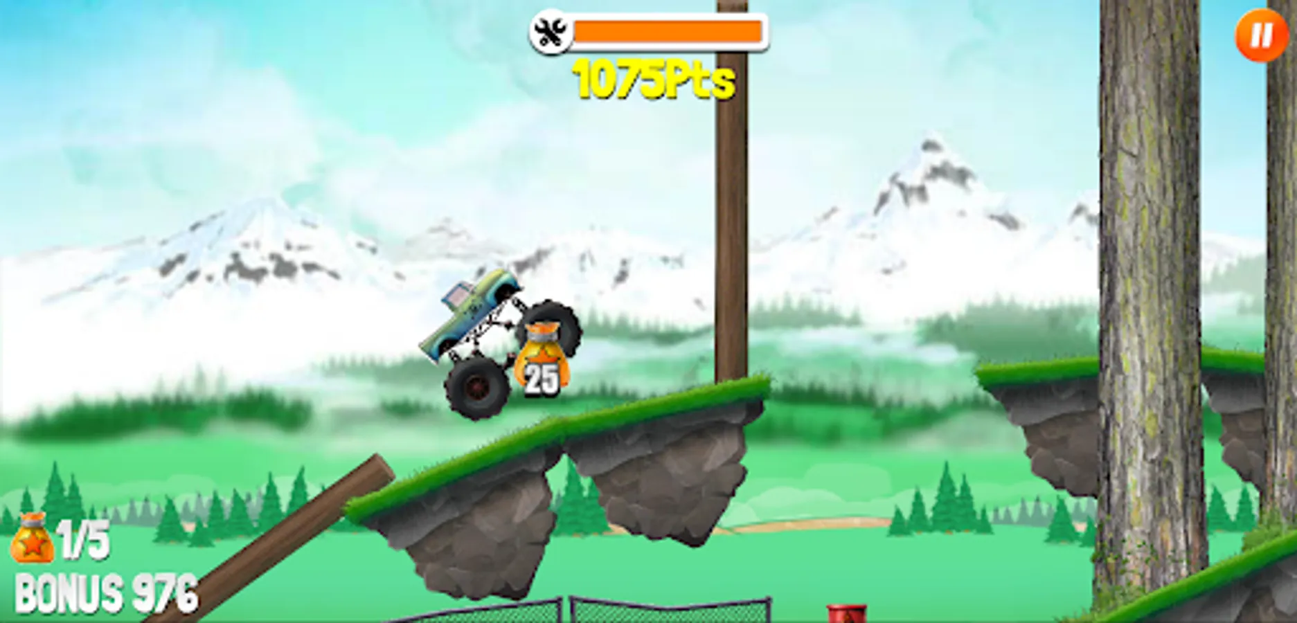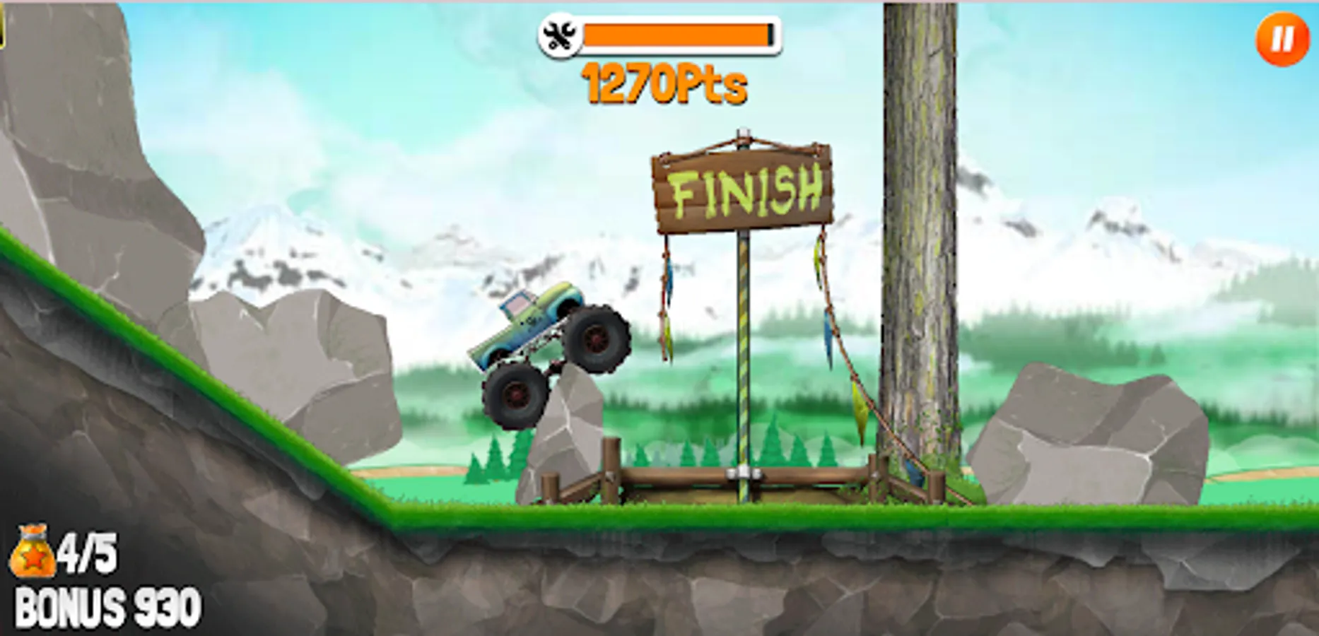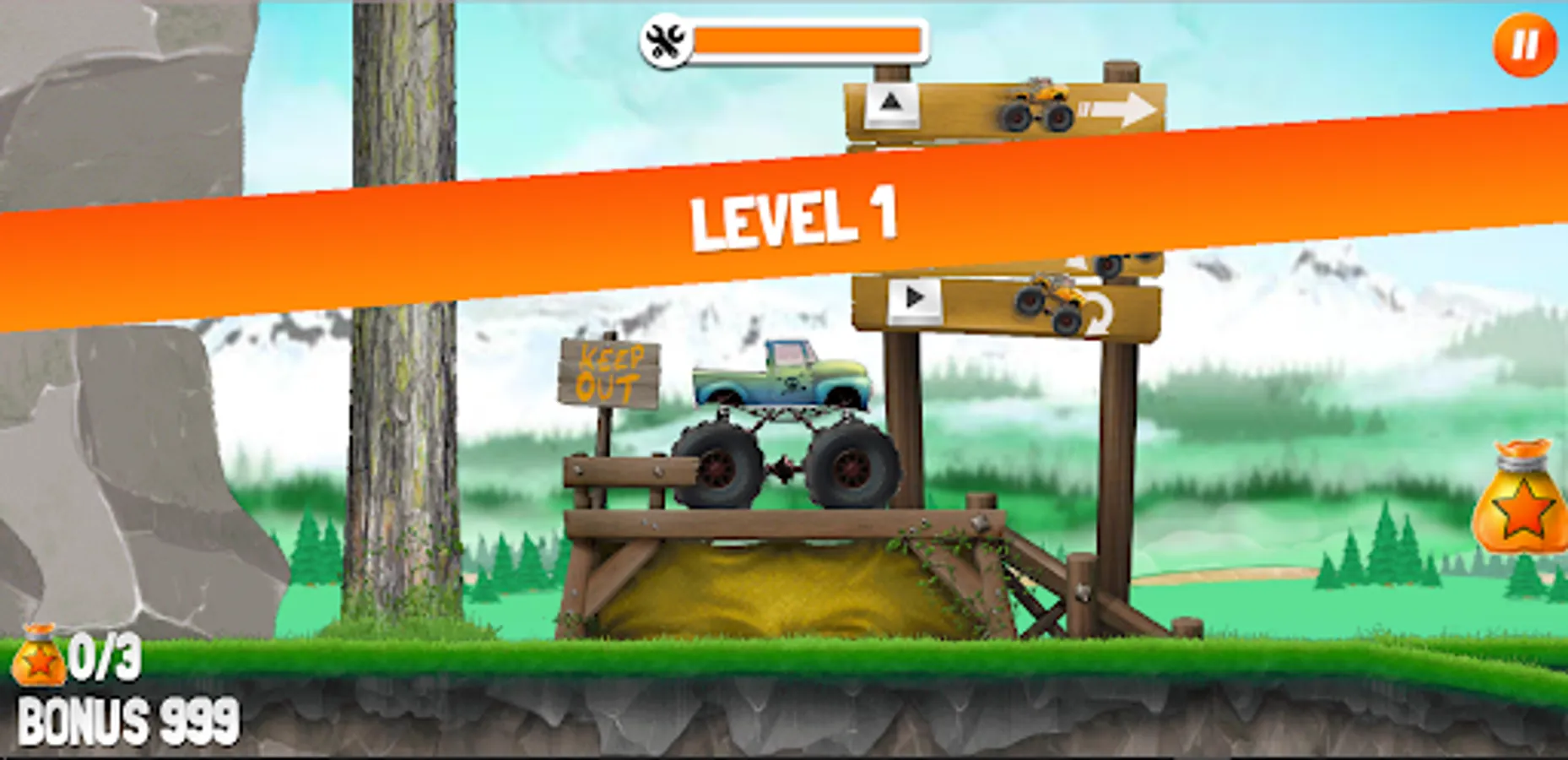 Get into your awesome monster truck, crush obstacles and reach the finish line as fast as you can! In this cool side-scrolling truck challenge it's all about your driving skills. Collect star bags and navigate your way through tricky terrain. Unlock new and better vehicles and be careful not to take too much damage - otherwise the game is over! Can you earn a top spot on the leaderboard?