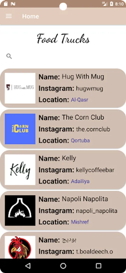 Truckat shows a list of foodtrucks in Kuwait that contains the name, instagram, and location of the foodtruck!