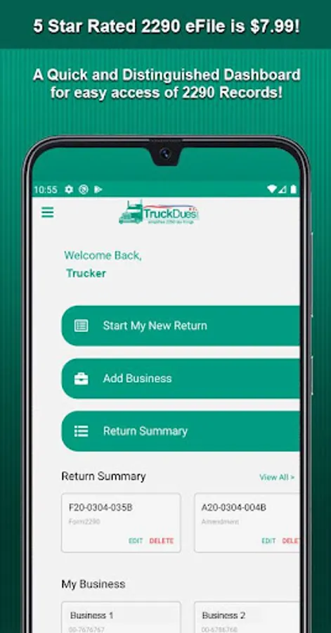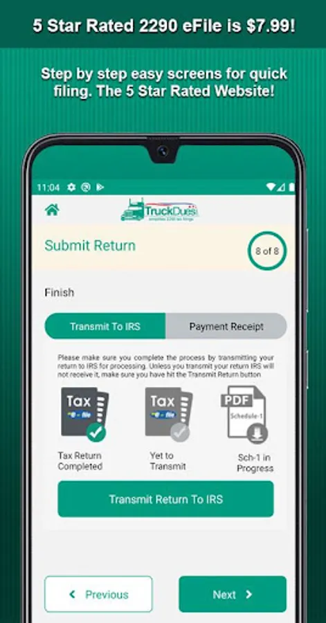 TruckDues Mobile App to report and pay the Federal Vehicle Use Tax Form 2290 returns with the IRS. Connect to the app from anywhere anytime to report and pay your Highway Vehicle Use Taxes. IRS watermarked Schedule 1 receipt is important for you and your business to keep everything intact. The safe and efficient 2290 tax reporting app can be handy when you need your 2290s done while you’re on road. Record keeping is easy, you can share your Schedule 1 PDF instantly by downloading it into your mobile phone from the app. This handy 2290 tax efile app is available for free download on your Android and Apple phones and tablets.