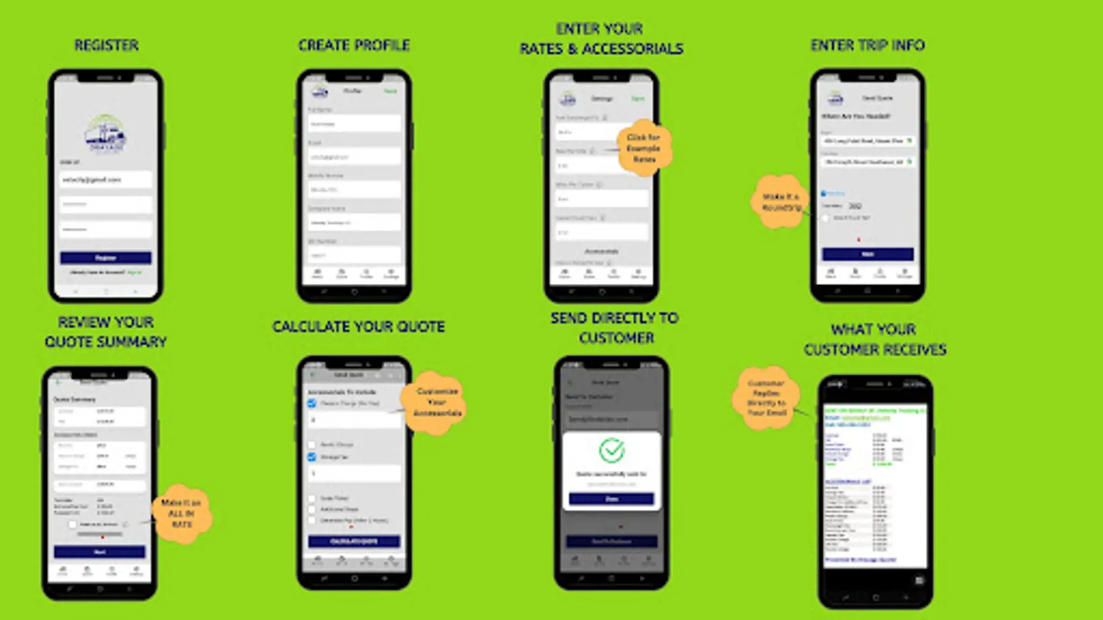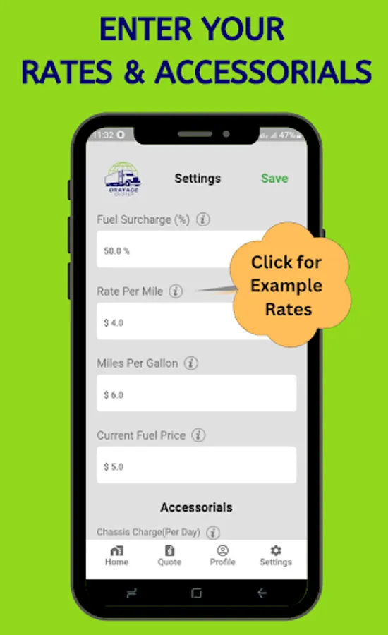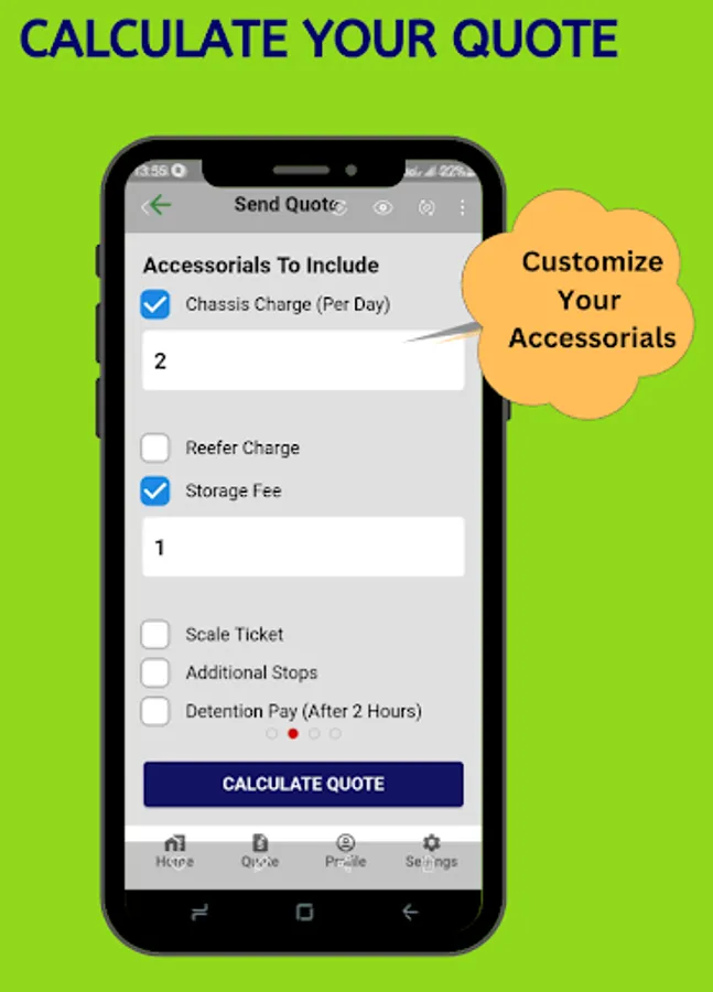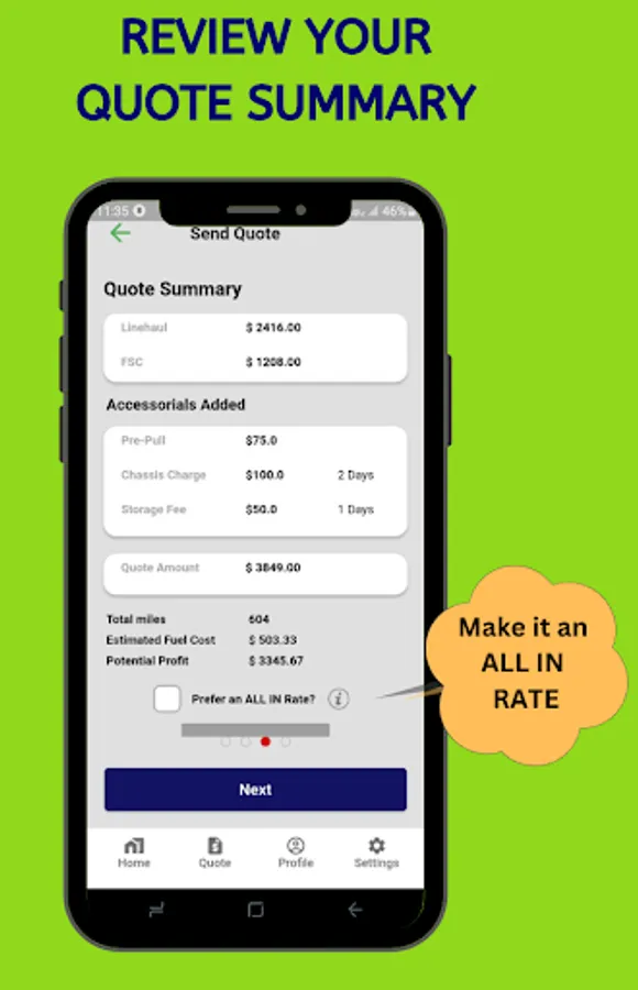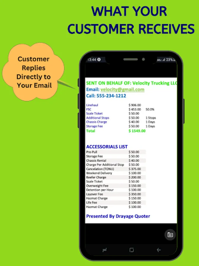 This simple tool is used to email drayage quotes to Customers while on the go. Drayage Quoter will calculate your Fuel Cost and Potential Profit based on Total Miles. You can customize your quote by entering your Accessorial charges, such as FSC, Rate Per Mile, Detention, Storage Fee, Chassis Fee and many others.