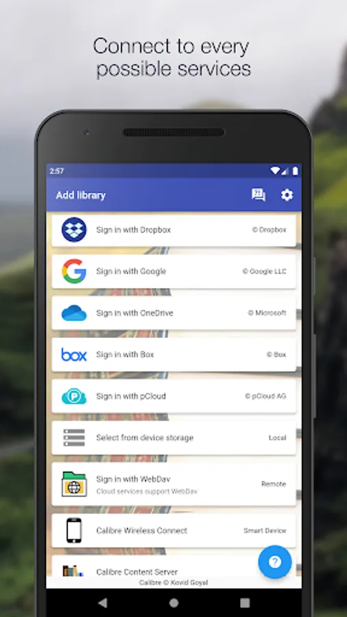 - help you access full Calibre libraries on most popular personal cloud services, including Google Drive, Dropbox, Microsoft OneDrive, Box, pCloud, MEGA, WebDav, Nextcloud and OwnCloud - simply the most supported for cloud services.
