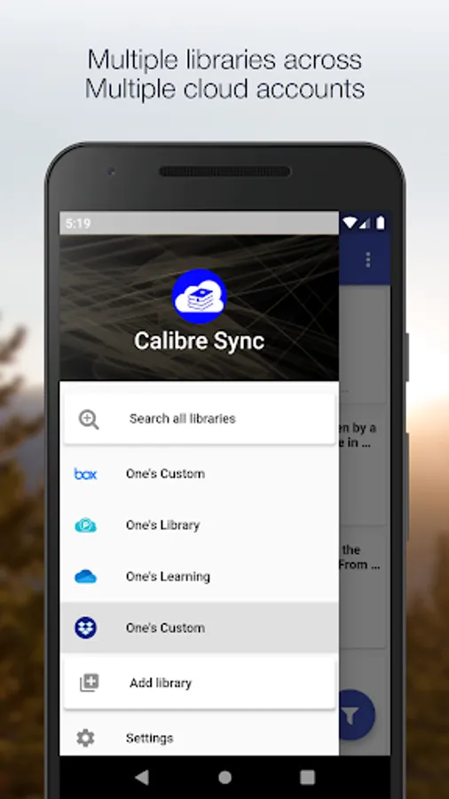 Move your Calibre libraries to your favourite cloud providers and access those libraries via Calibre Sync to browse, sort, search, download and read books on your device. Calibre Sync also supports multiple libraries across multiple Drive, Dropbox, OneDrive, Box, pCloud, MEGA, WebDav, Nextcloud, and OwnCloud accounts simultaneously.