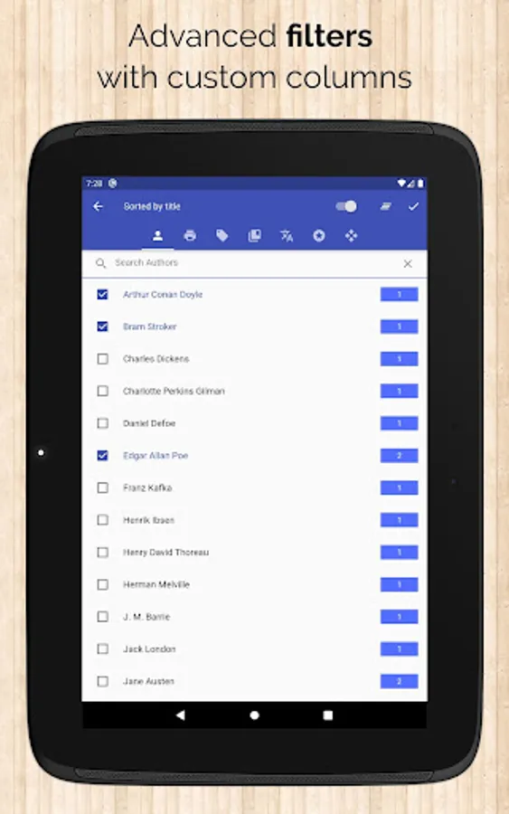 - Sort libraries by title, author, ratings, and several Date options - ascending and descending