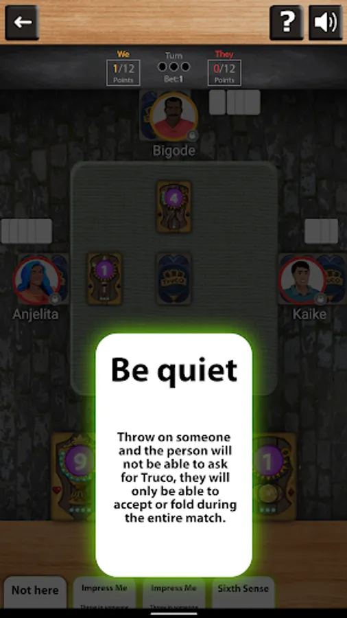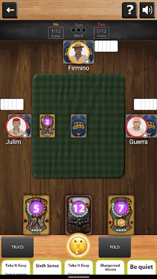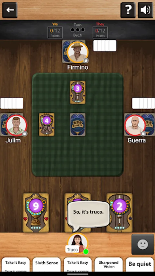 Our Artificial Intelligence was created in 2009 in our first Truco game for Windows XP and has been perfected ever since. You will be surprised by the ability of this Artificial Intelligence.