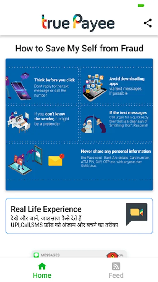 TruePayee is one of its kind app that focus on Customer protection against fraud Calls and SMSs. This app uses a fraud detection algorithm and warns customer of potential trap. You can also watch videos on latest methods of frauds happening around the world which are shared by other users /our app. One of the key feature of this app is that it keeps your personal data only to you.